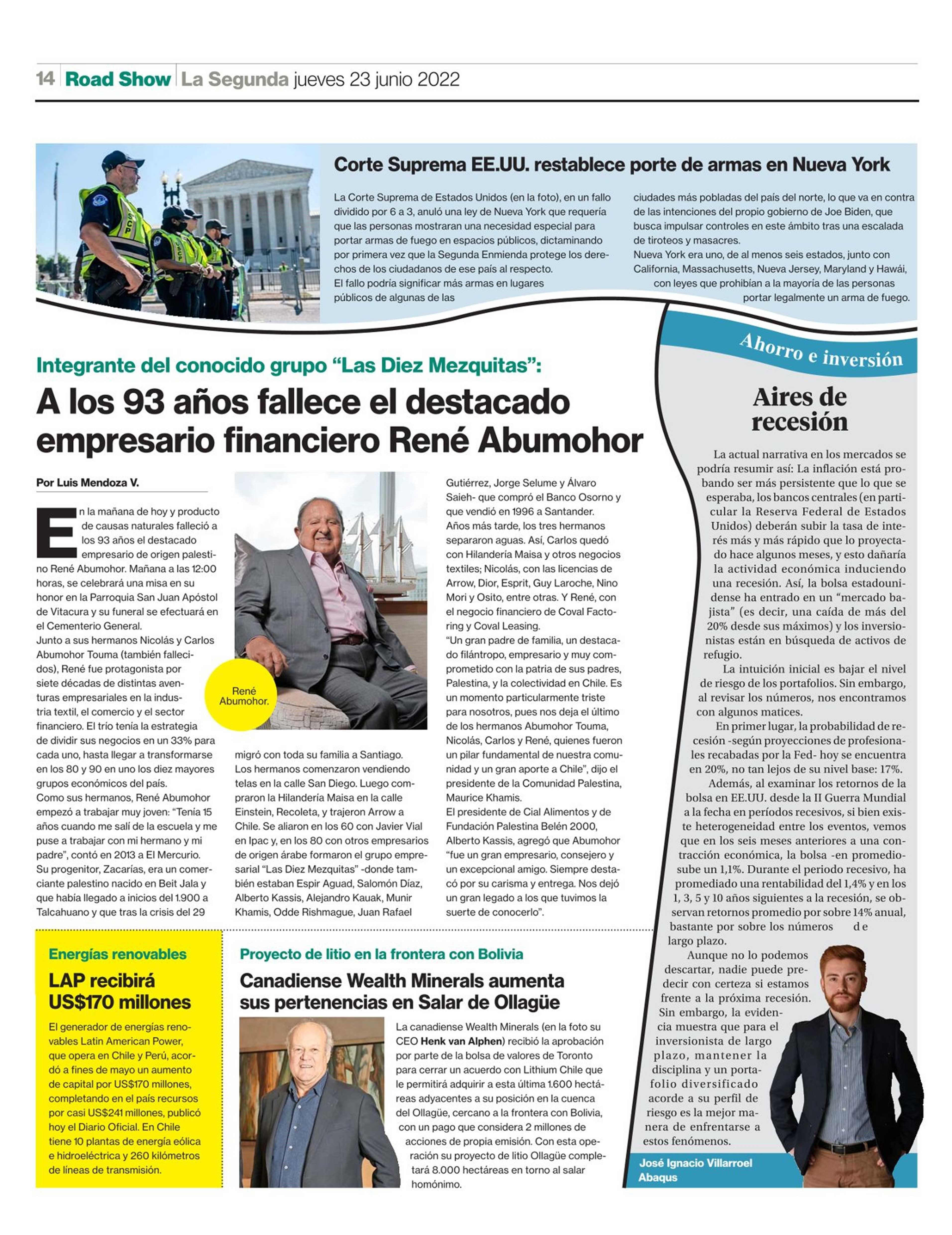 A los 93 años fallece el destacado empresario financiero René Abumohor 23-06-2022 La Segunda |