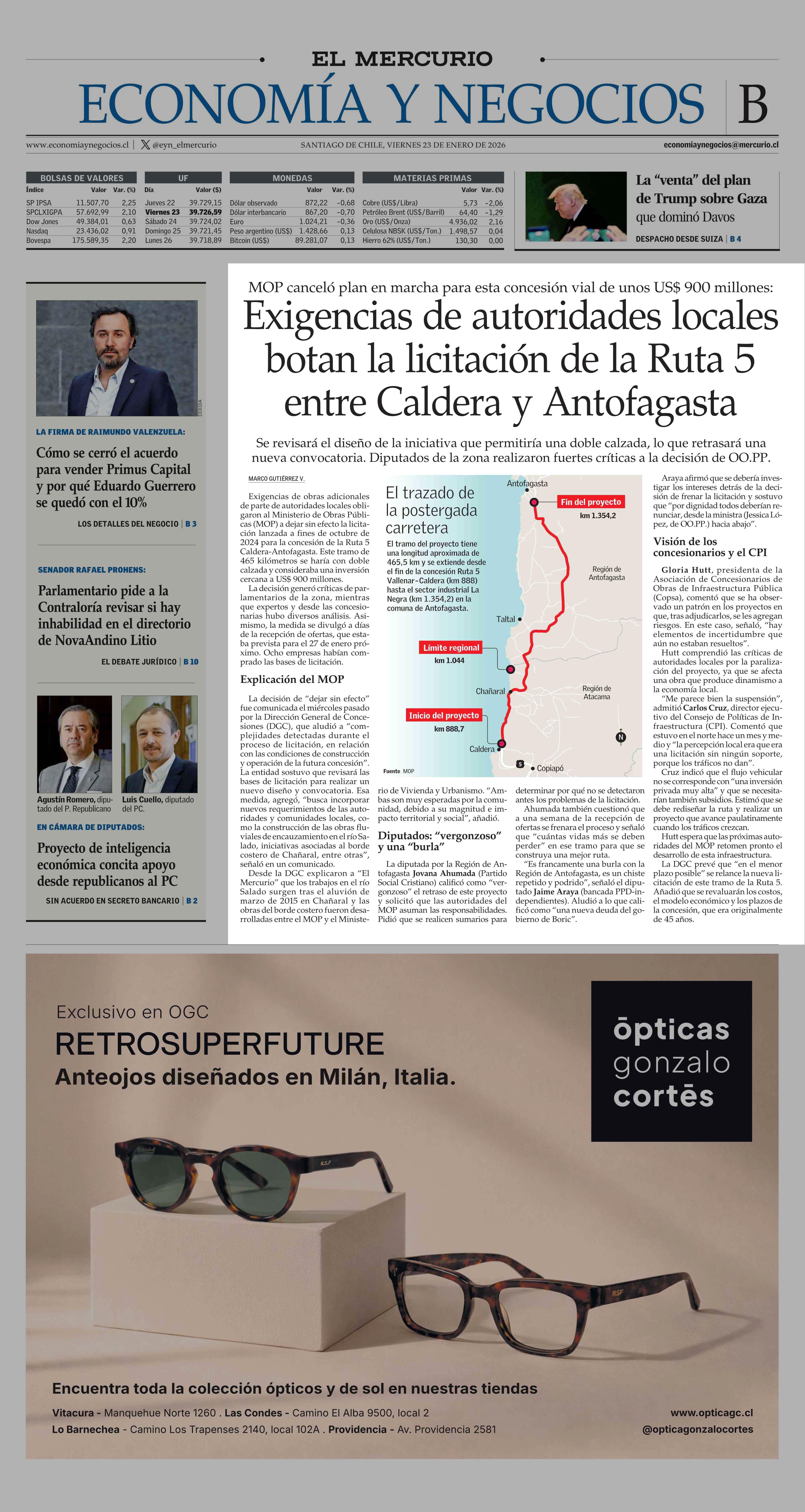 Exigencias de autoridades locales botan la licitación de la Ruta 5 entre Caldera y Antofagasta 23-01-2026 El Mercurio |