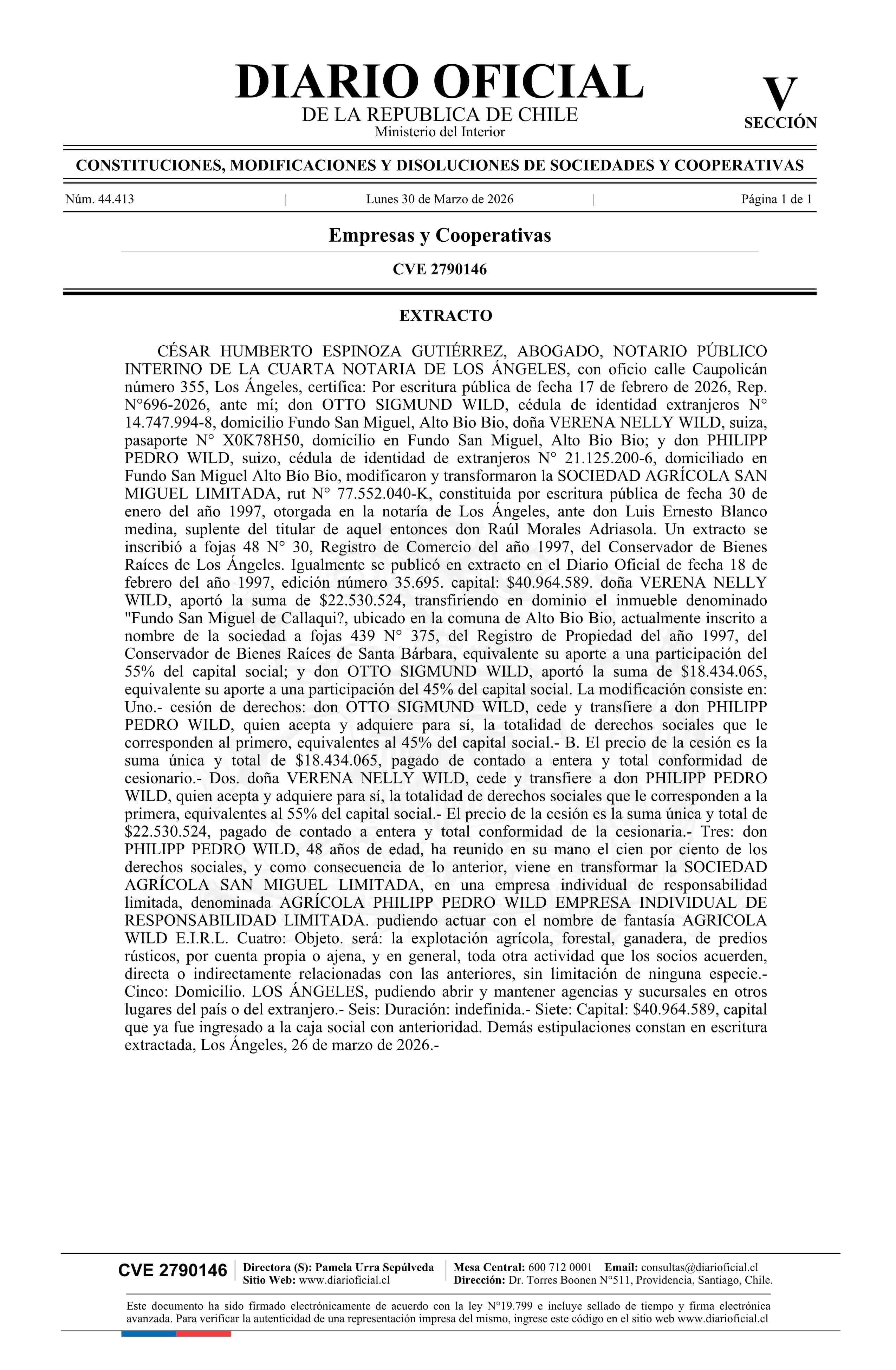 SOCIEDAD AGRÍCOLA SAN MIGUEL LIMITADA 77.552.040-K* 30-03-2026 Diario Oficial Edición Electrónica |