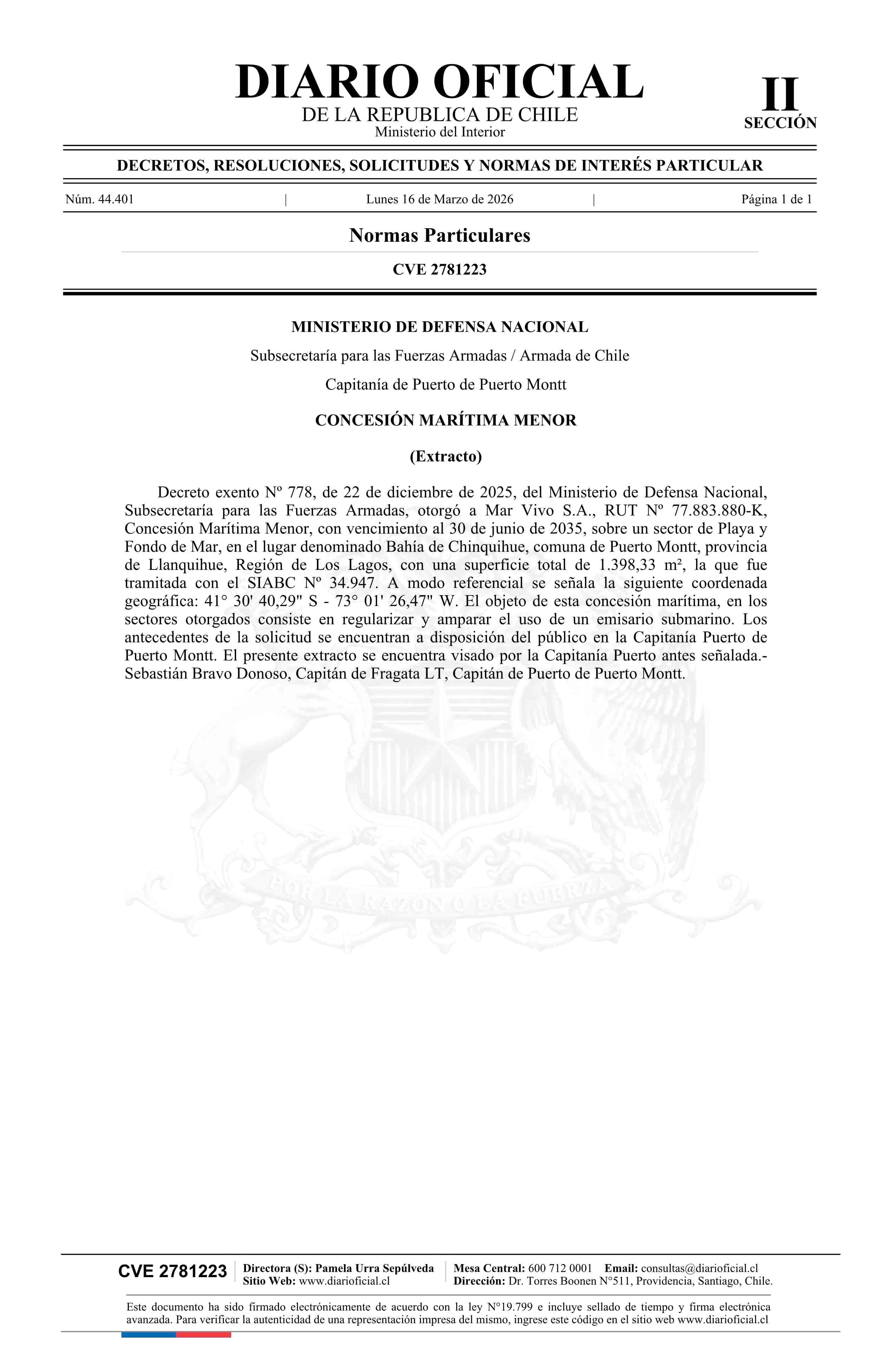 Extracto de decreto exento número 778, de 2025.- Concesión marítima menor 16-03-2026 Diario Oficial Edición Electrónica |