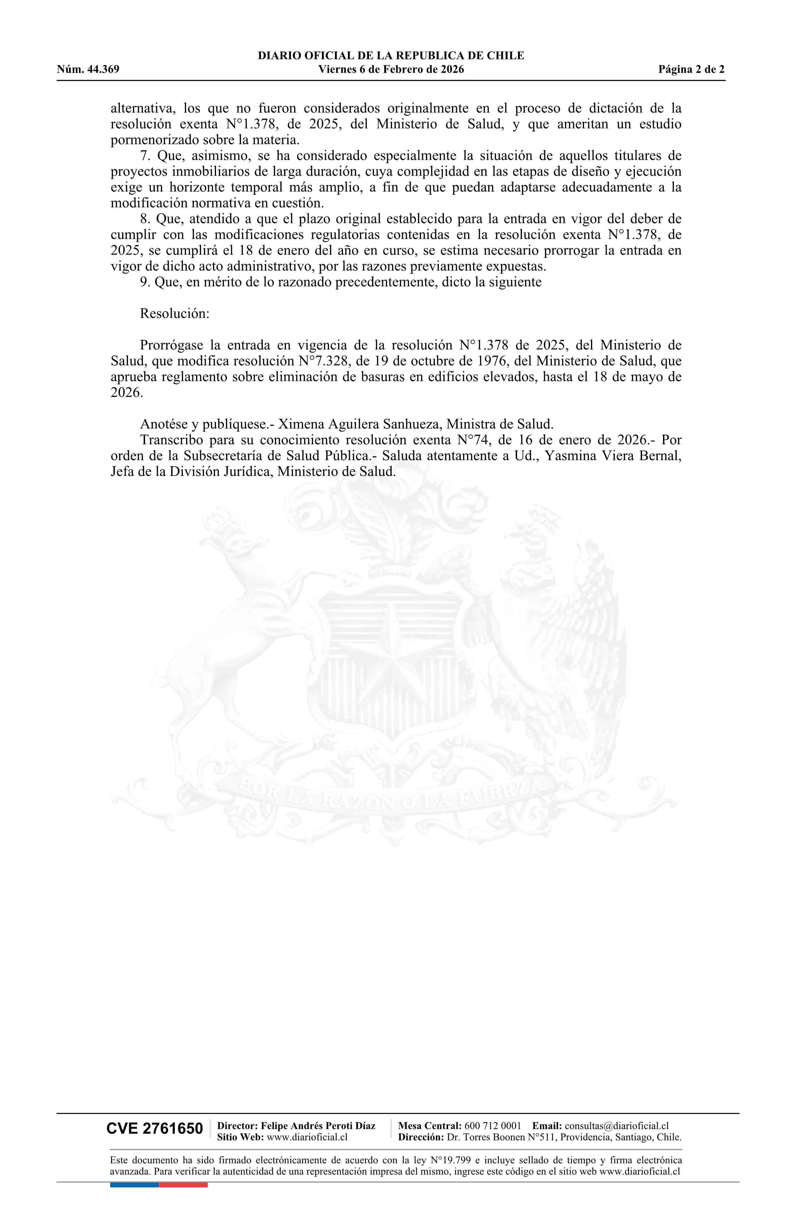 | Título: | Resolución exenta número 74, de 2026.- Prorroga la entrada en vigencia de la resolución N° 1.378 exenta, de 2025, que modifica resolución N° 7.328, de 1976, que aprueba Reglamento sobre Eliminación de Basuras en Edificios Elevados |
