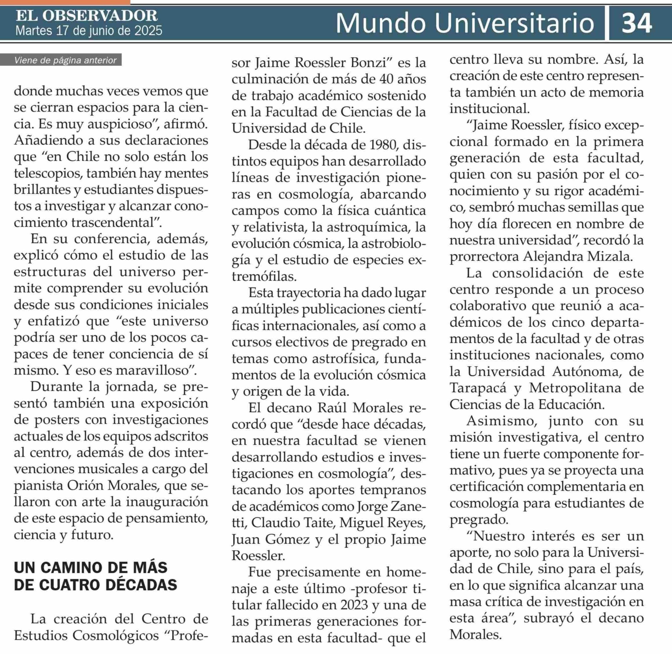 Inauguran centro pionero en cosmologia con enfoque transdisciplinario 17-06-2025 El Observador |