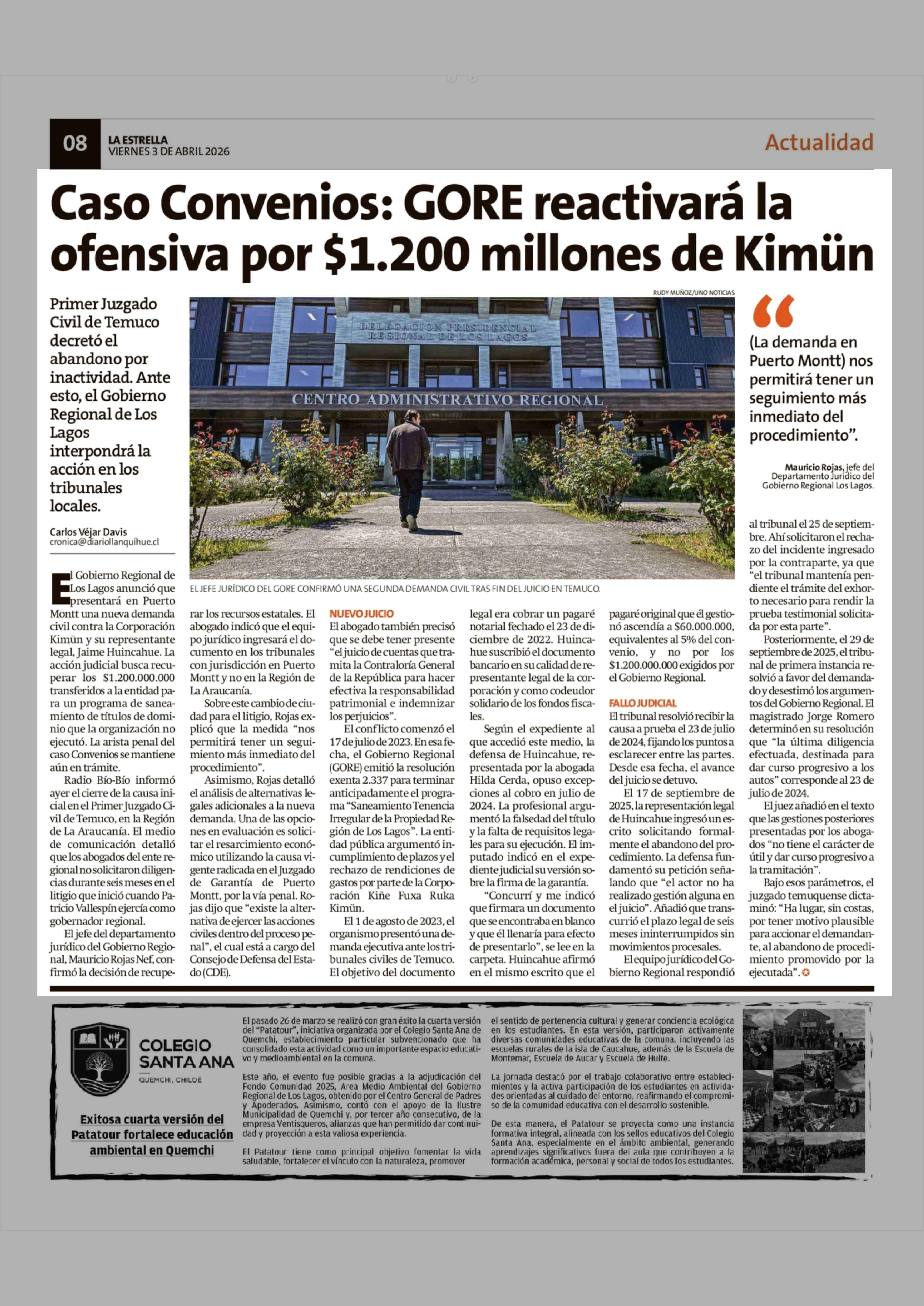 Caso Convenios: GORE reactivará la ofensiva por $1.200 millones de Kimün 03-04-2026 La Estrella de Chiloé |