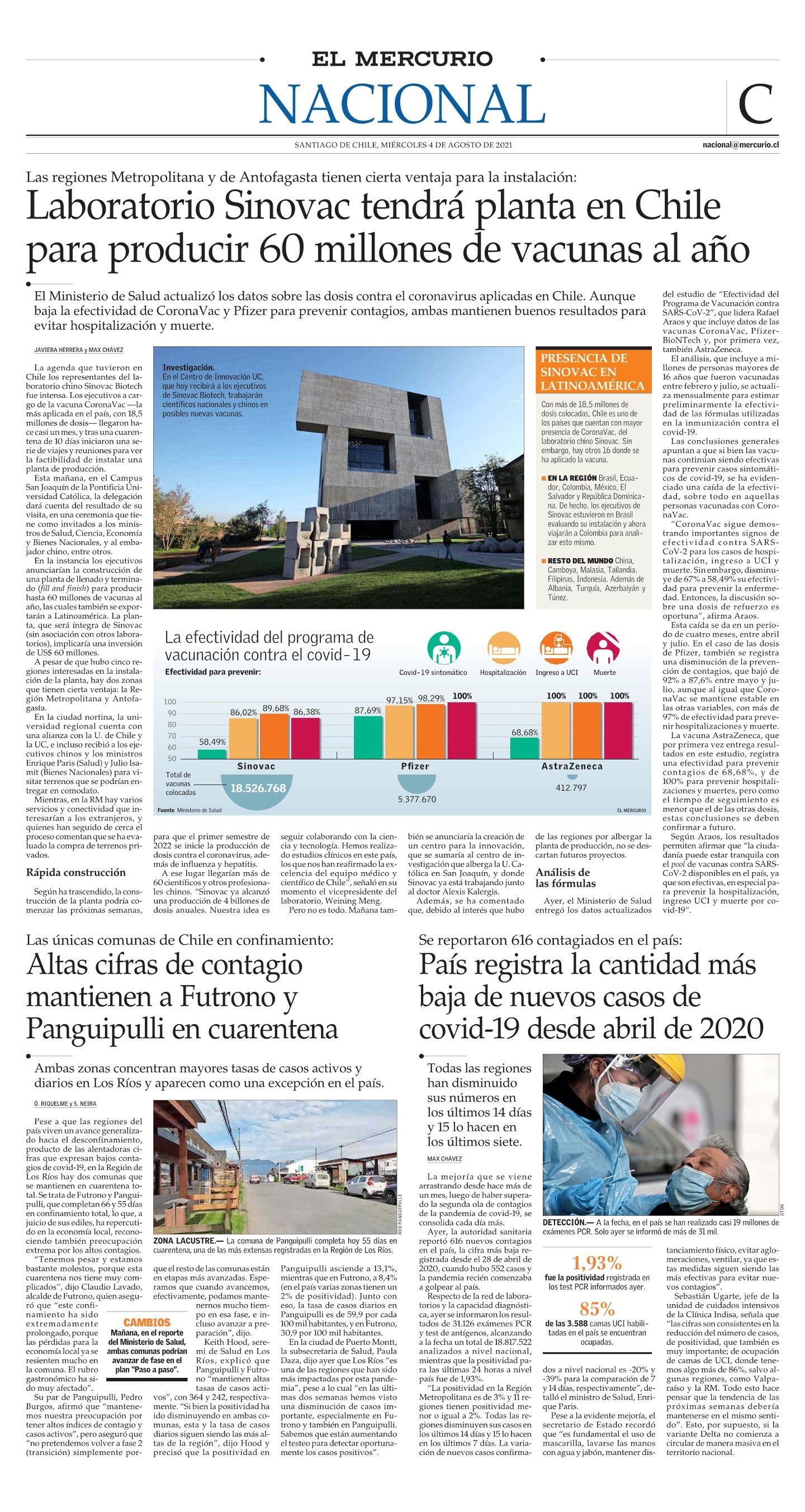 Laboratorio Sinovac tendrá planta en Chile para producir 60 millones de vacunas al año 04-08-2021 El Mercurio |