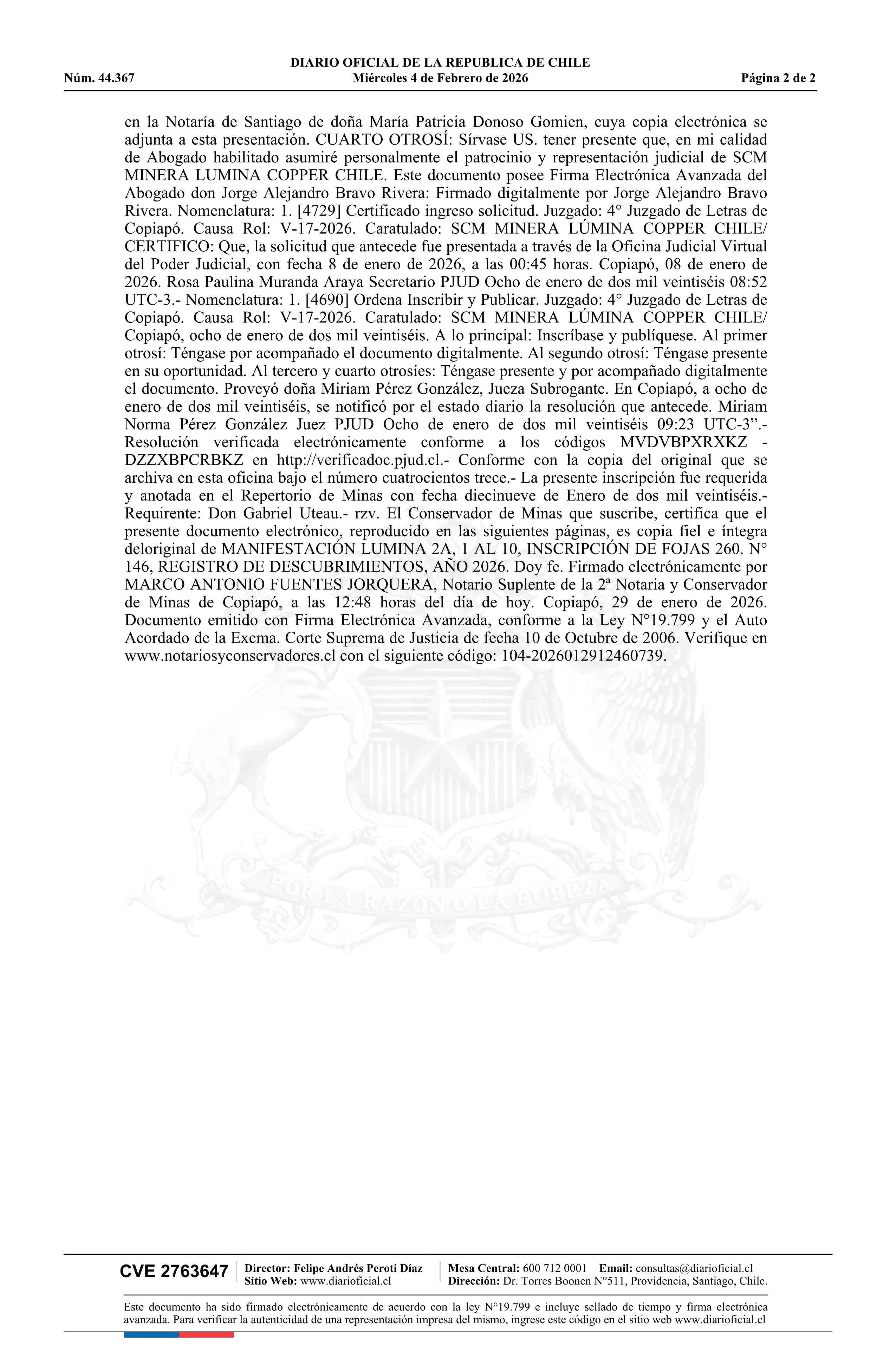 LUMINA 2A, 1 AL 10 / SCM Minera Lumina Copper Chile 04-02-2026 DIARIO OFICIAL CHILE - BOLETÍN OFICIAL DE MINERÍA |
