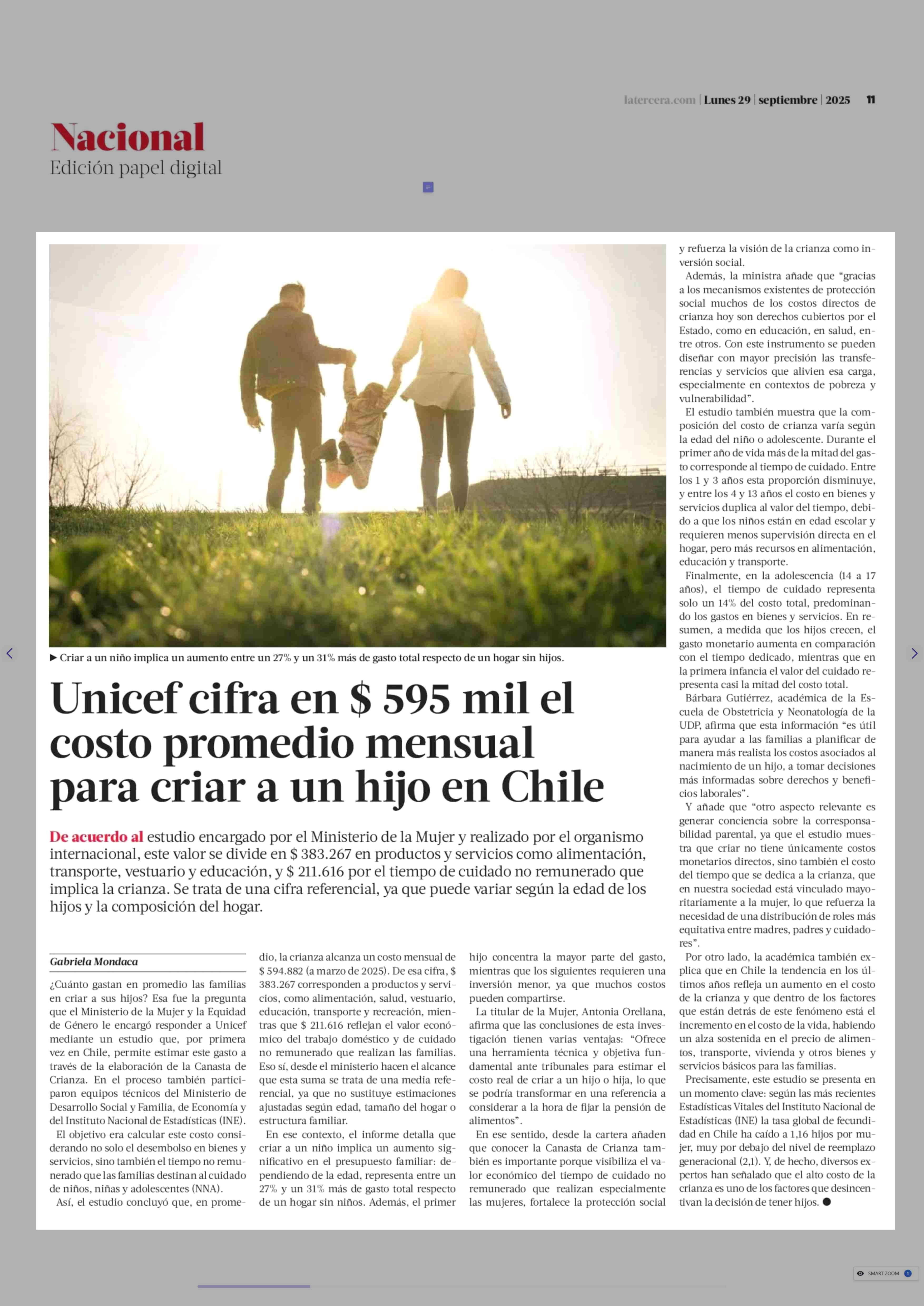 Unicef cifra en $ 595 mil el costo promedio mensual para criar a un hijo en Chile 29-09-2025 La Tercera |
