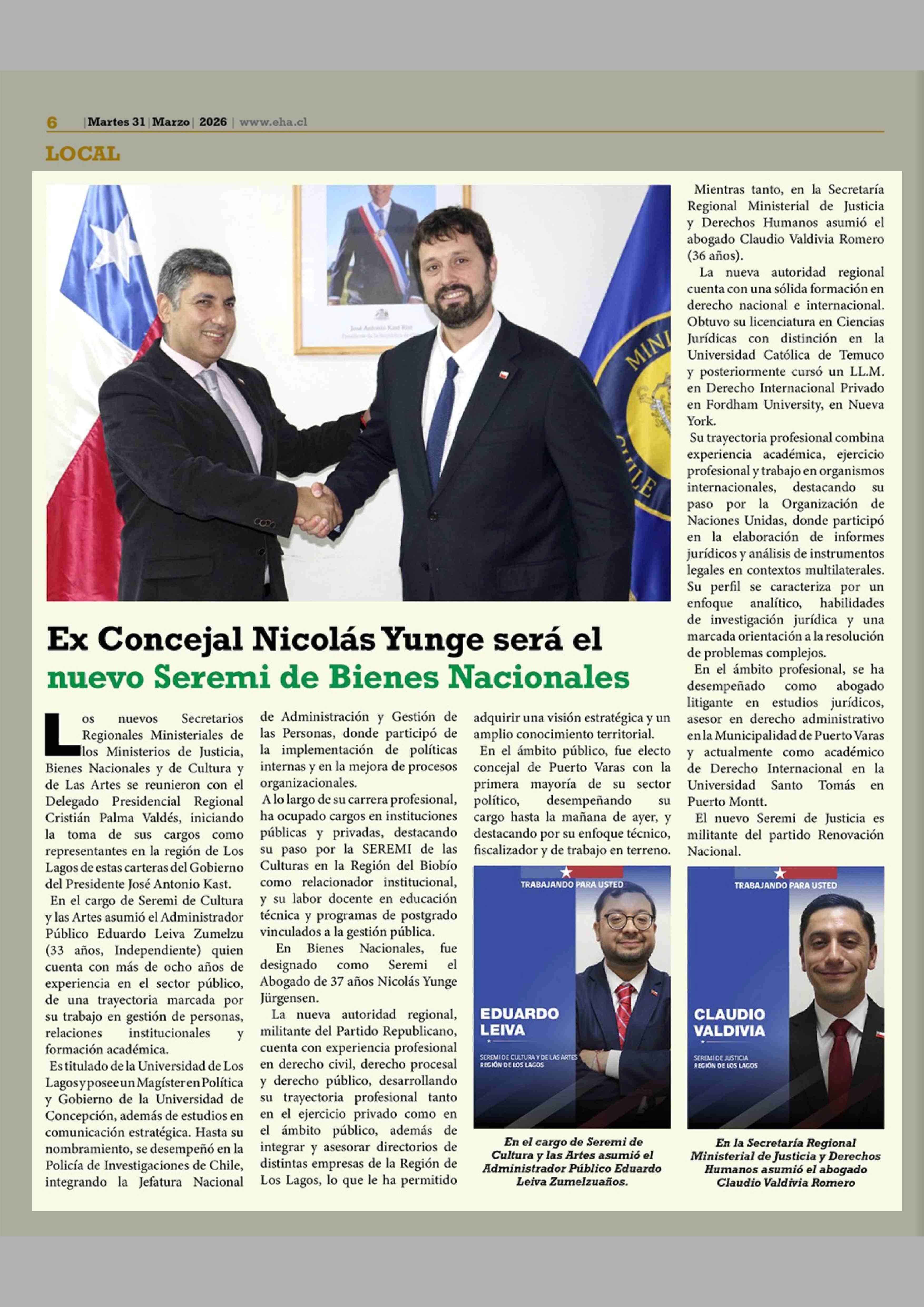 Ex Concejal Nicolás Yunge será el nuevo Seremi de Bienes Nacionales 31-03-2026 El Heraldo Austral |