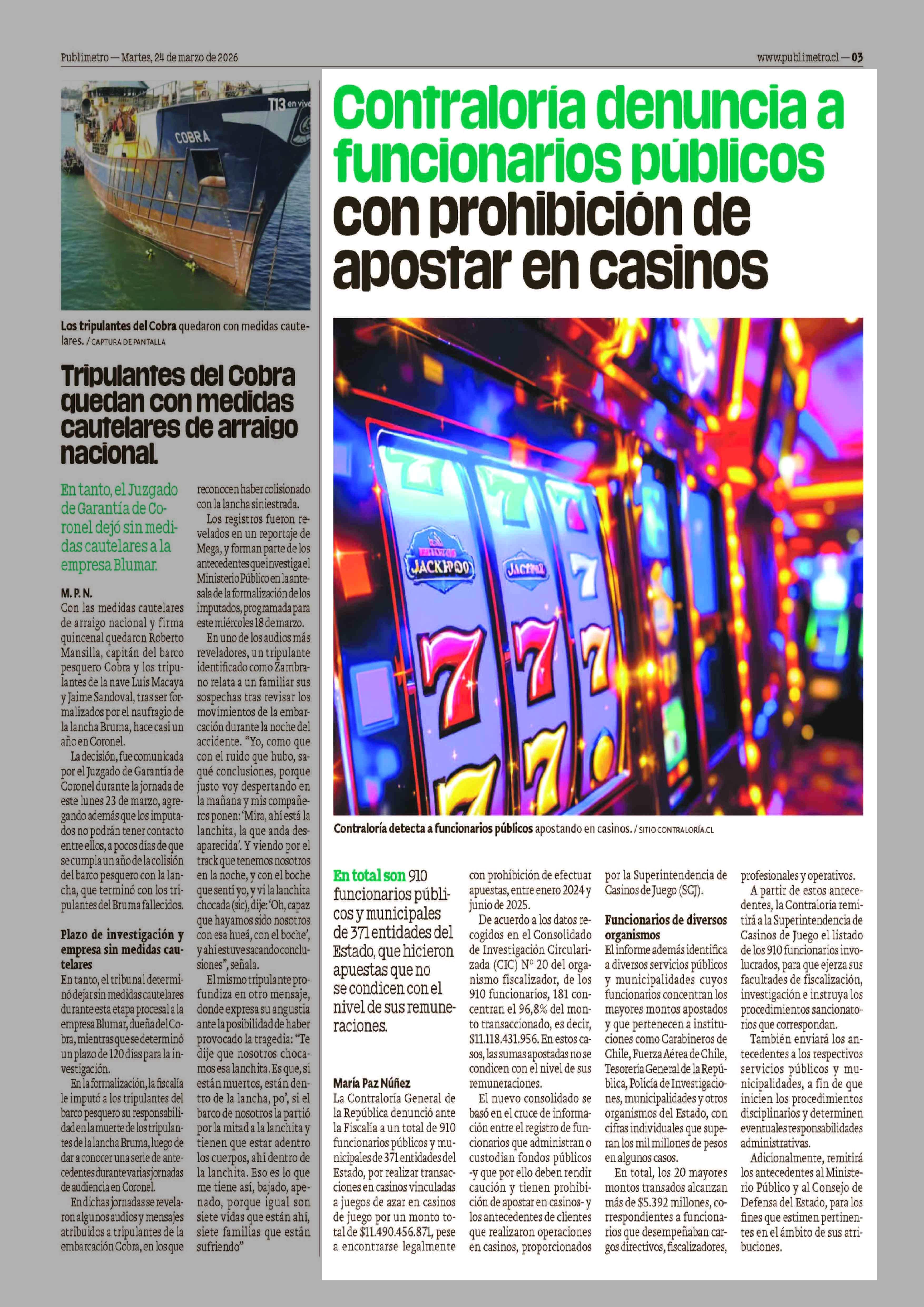Contraloria denuncia a funcionarios públicos con prohibición de apostar en casinos 24-03-2026 Publimetro |