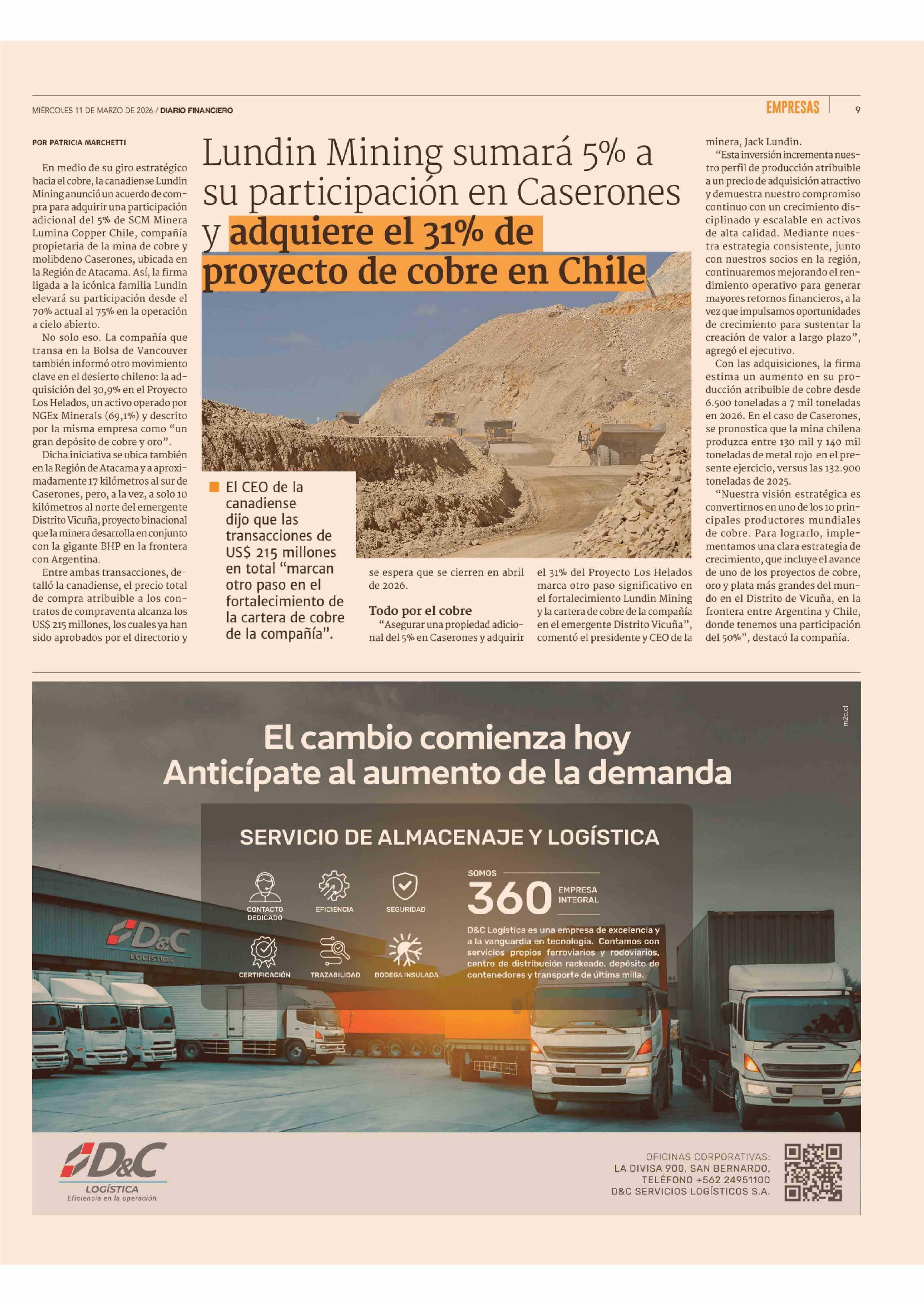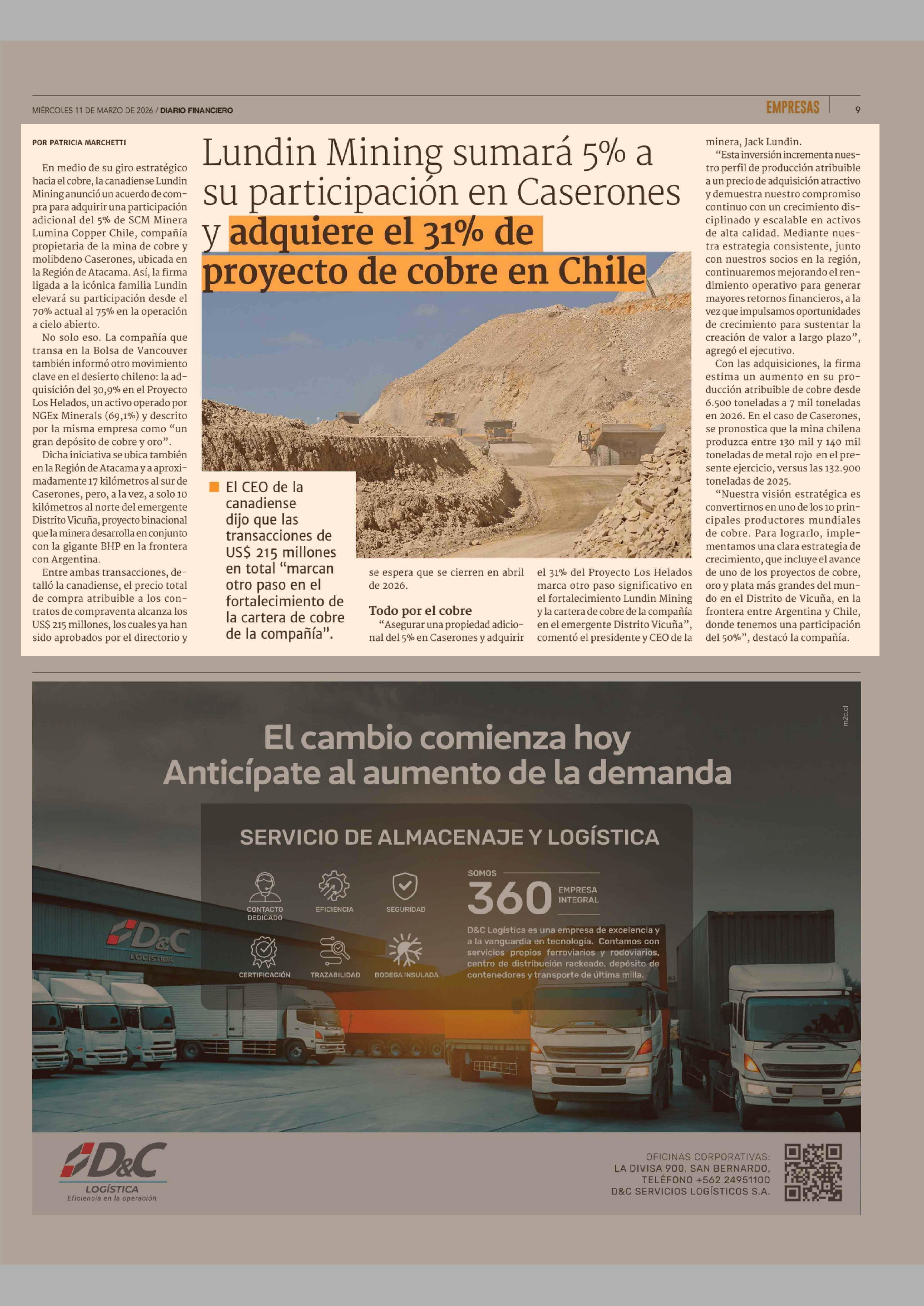 Título: Lundin Mining sumará 5% a su participación en Caserones y adquiere el 31% de proyecto de cobre en Chile