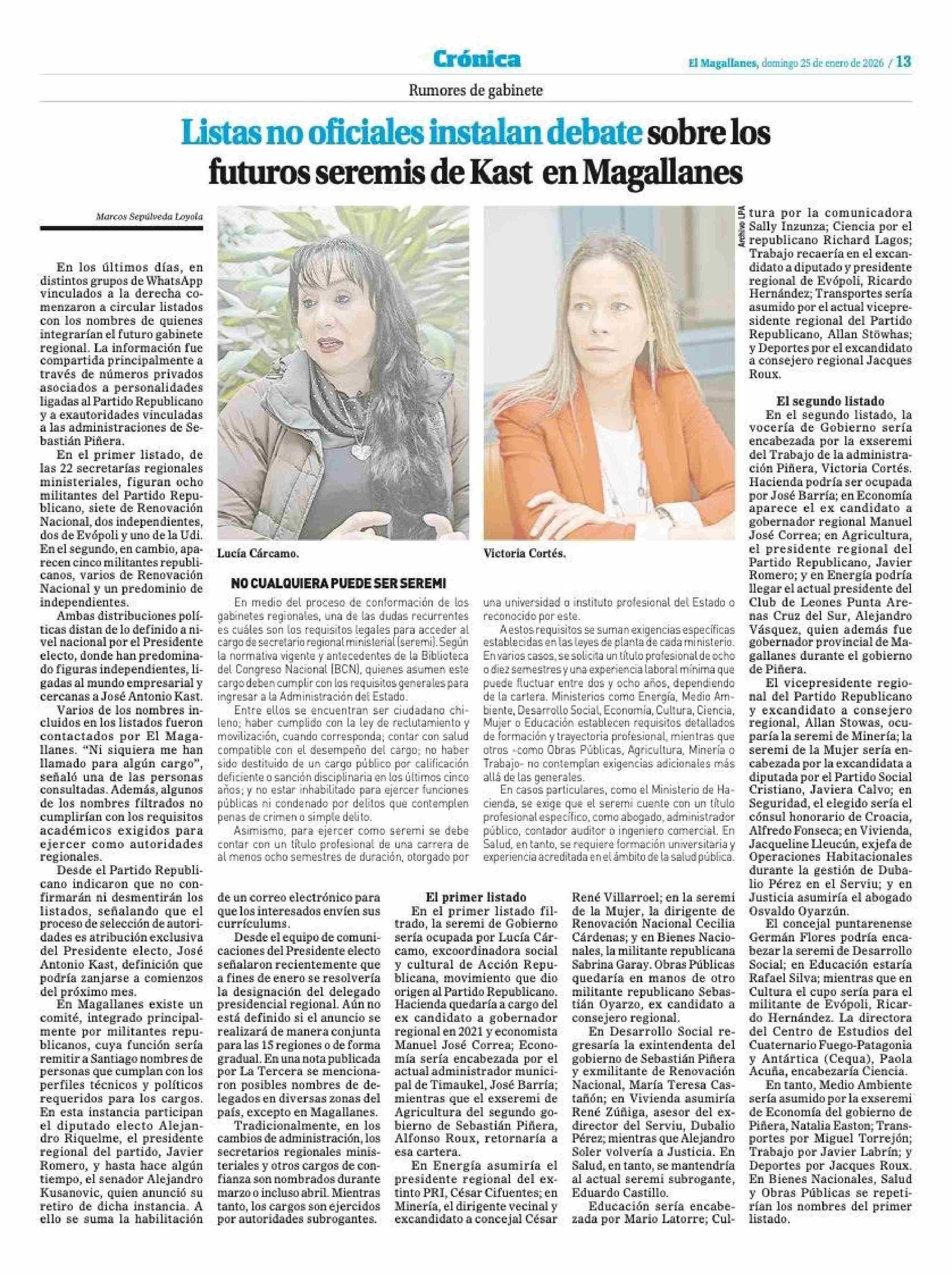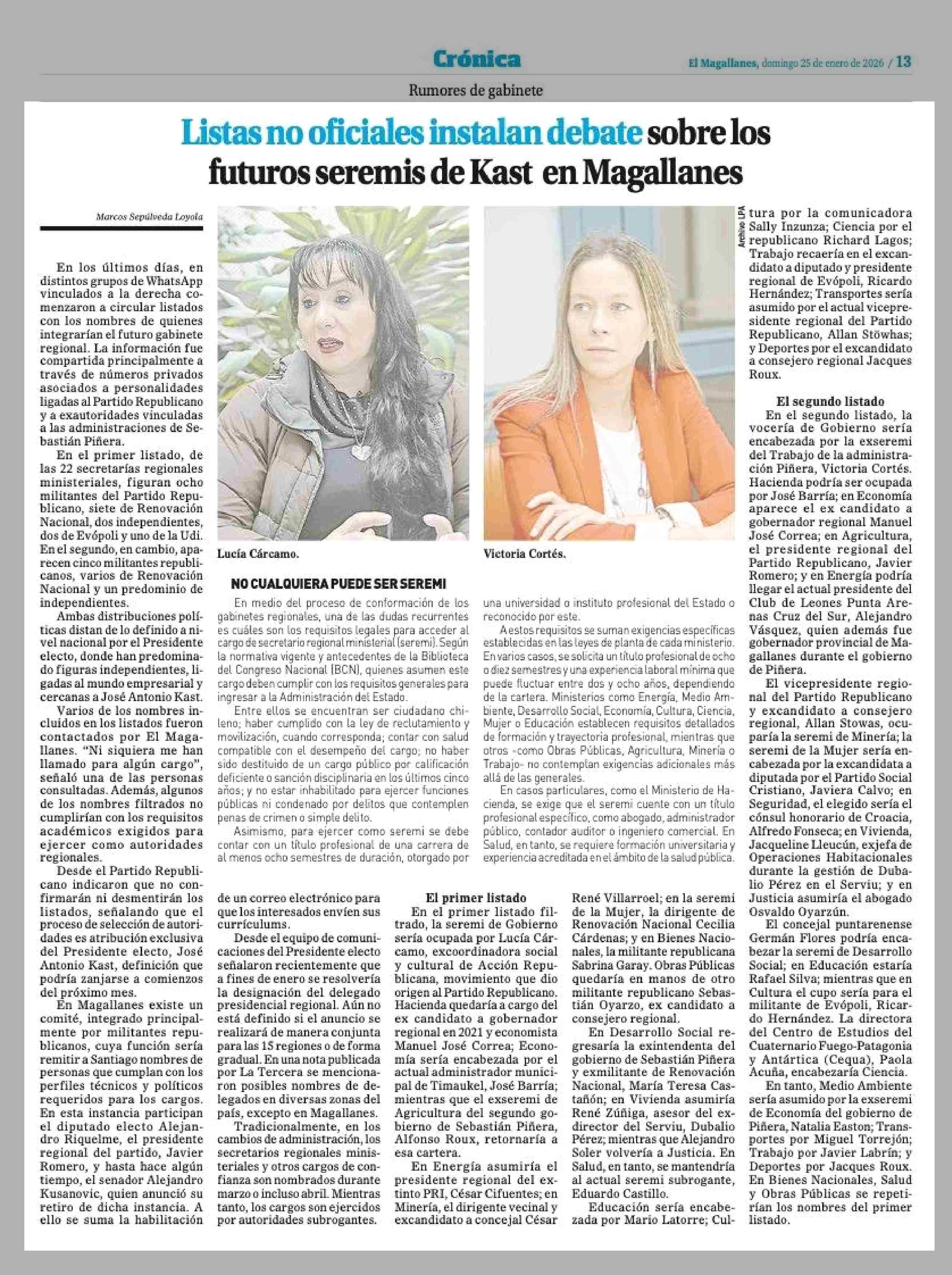 Título: Listas no oficiales instalan debate sobre los futuros seremis de Kast en Magallanes