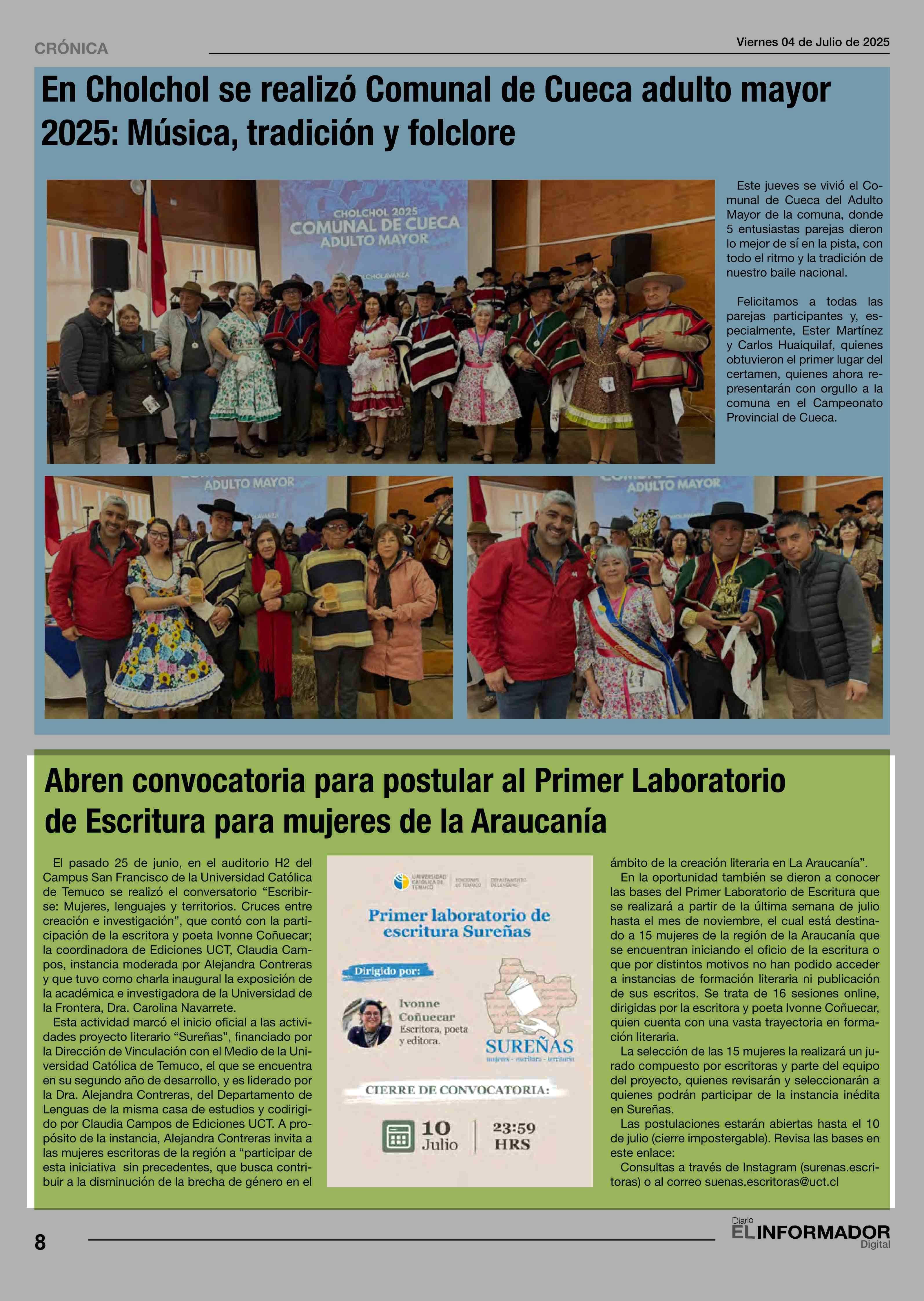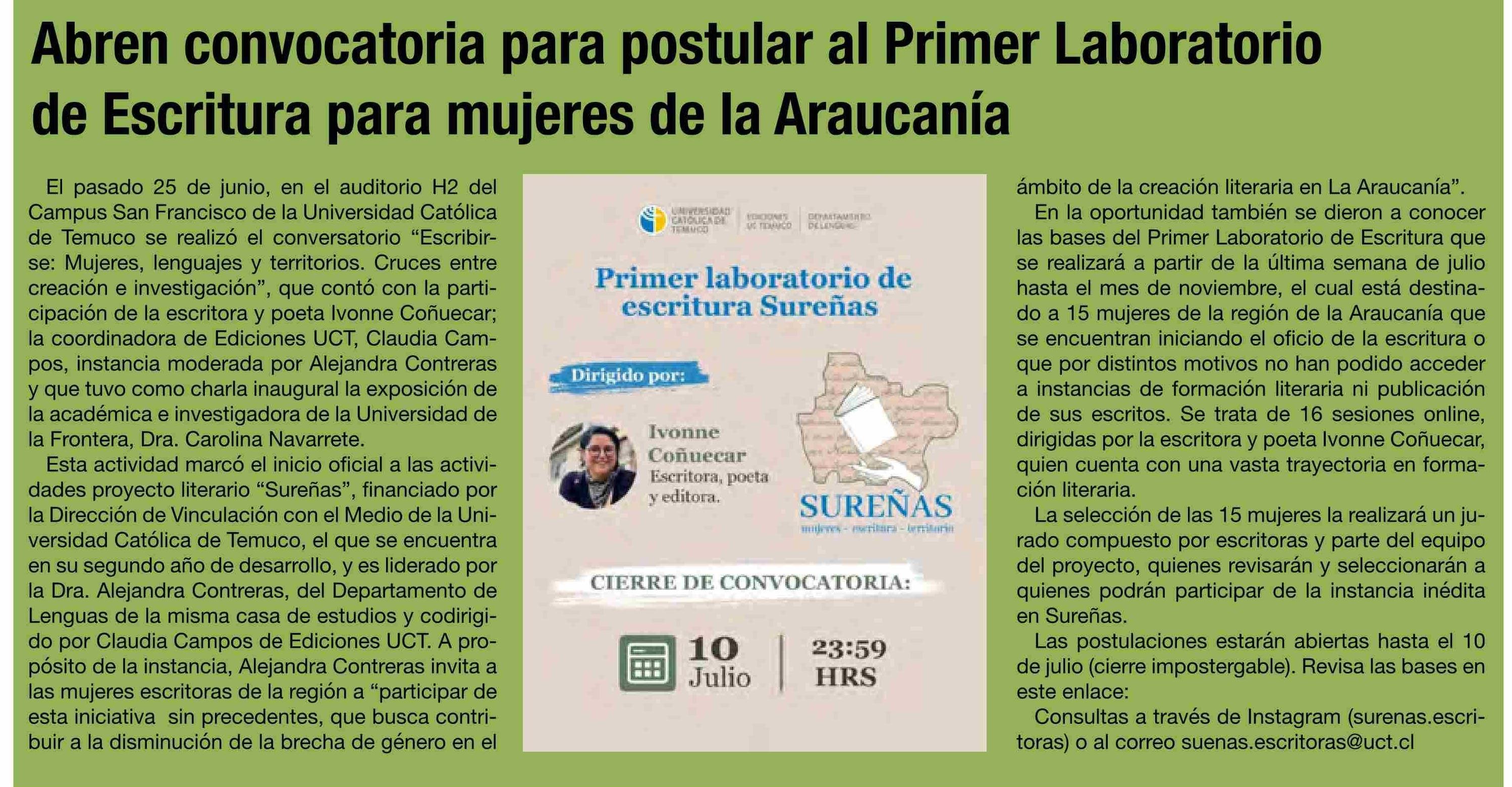 Abren convocatoria para postular al Primer Laboratorio de Escritura para mujeres de la Araucanía 04-07-2025 El Informador |