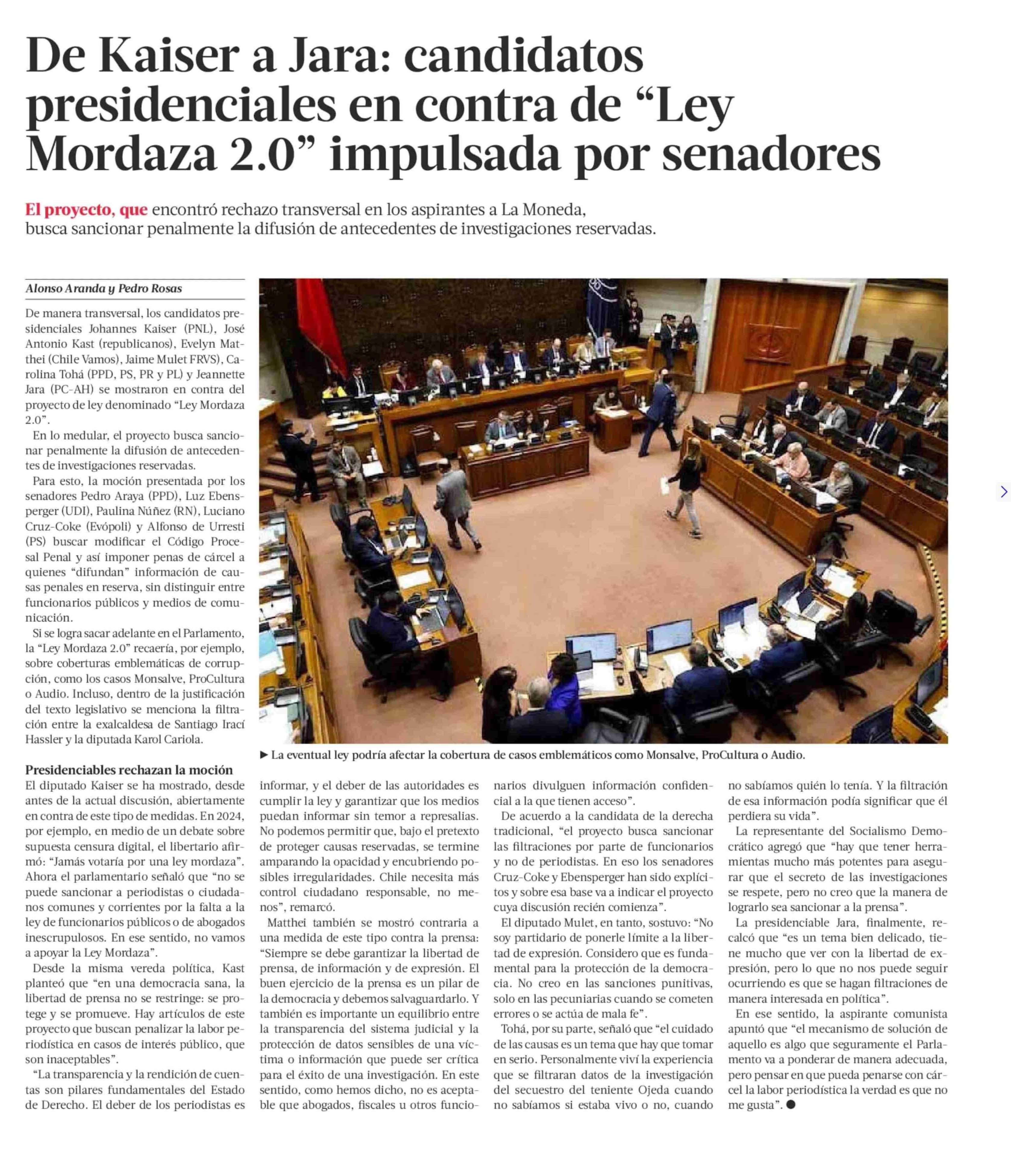 De Kaiser a Jara: candidatos presidenciales en contra de “Ley Mordaza 2.0” impulsada por senadores 13-06-2025 La Tercera |