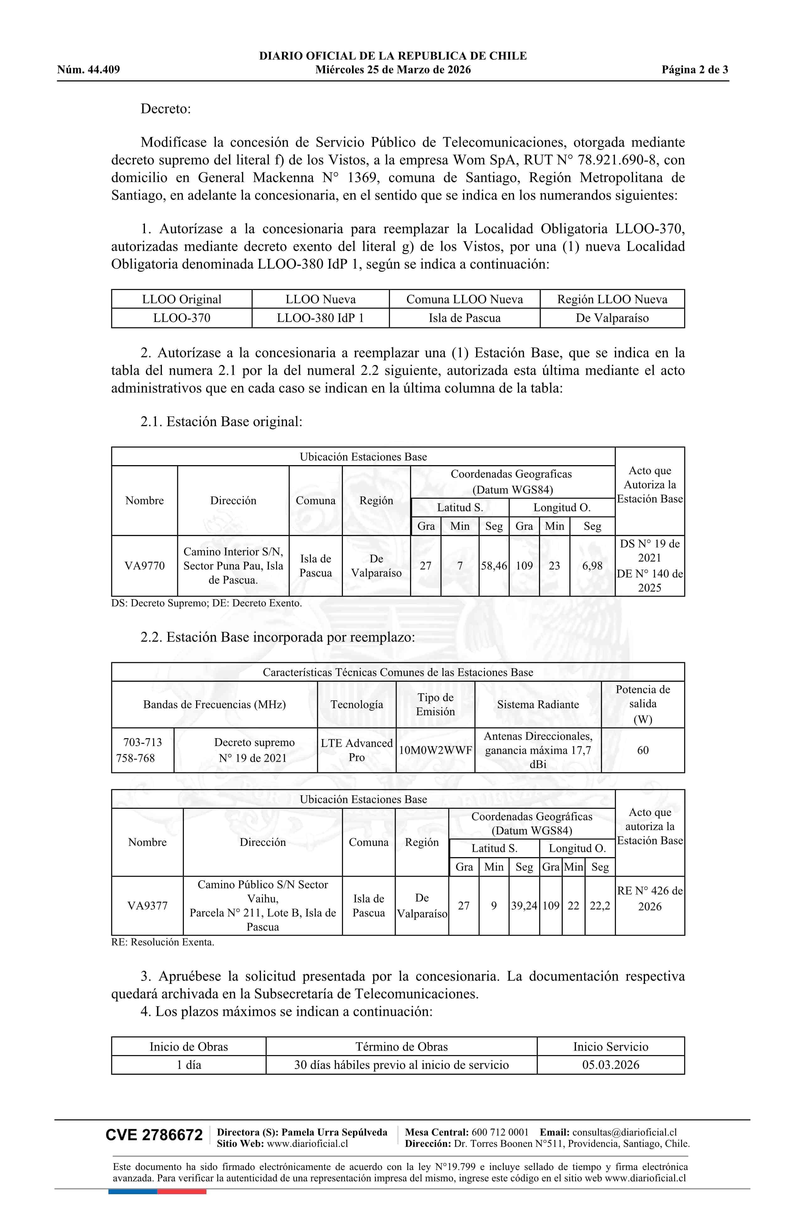 Decreto exento número 195, de 2026.- Modifica concesión de servicio público de telecomunicaciones a la empresa Wom SpA