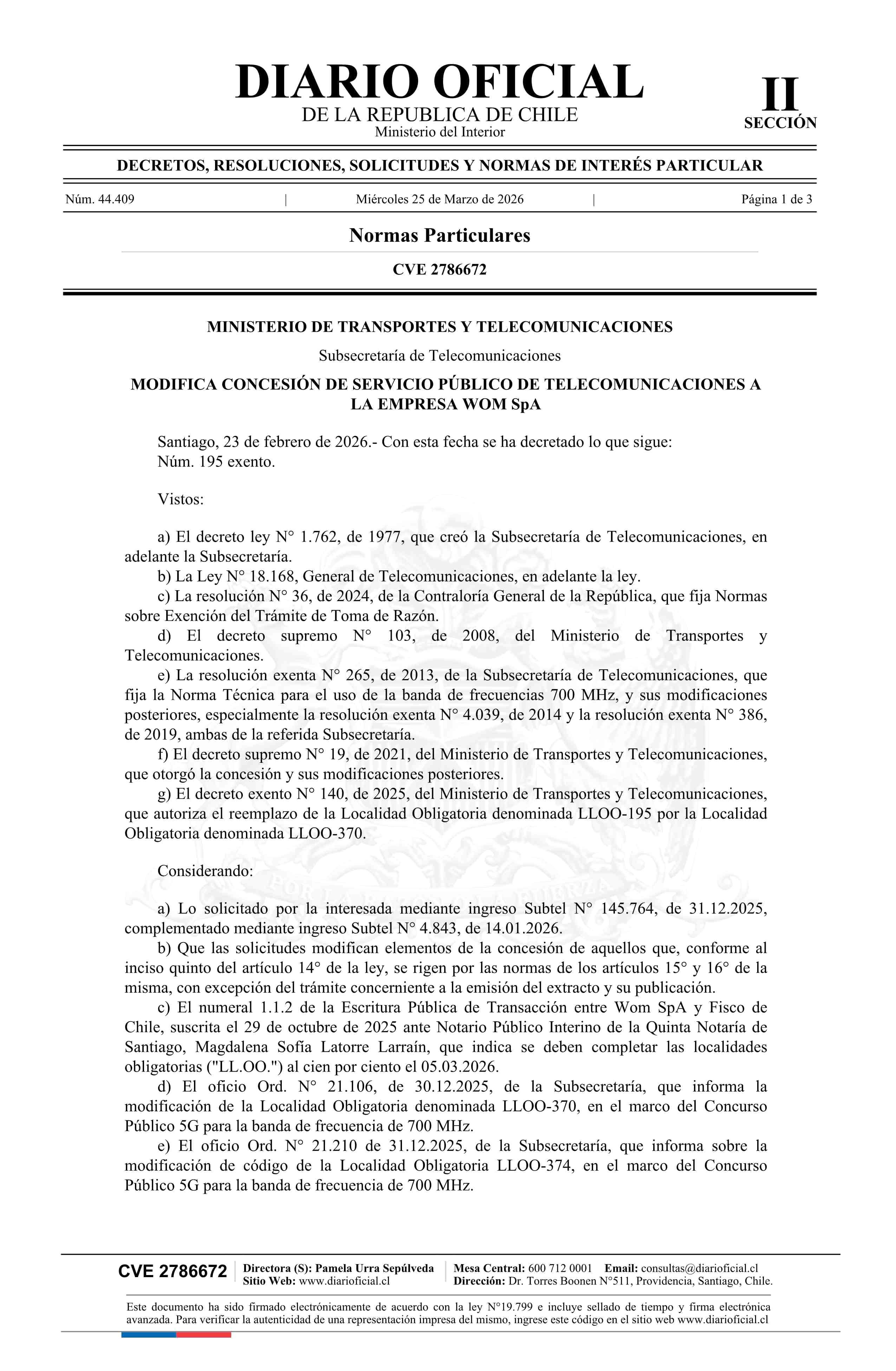 Título: Decreto exento número 195, de 2026.- Modifica concesión de servicio público de telecomunicaciones a la empresa Wom SpA