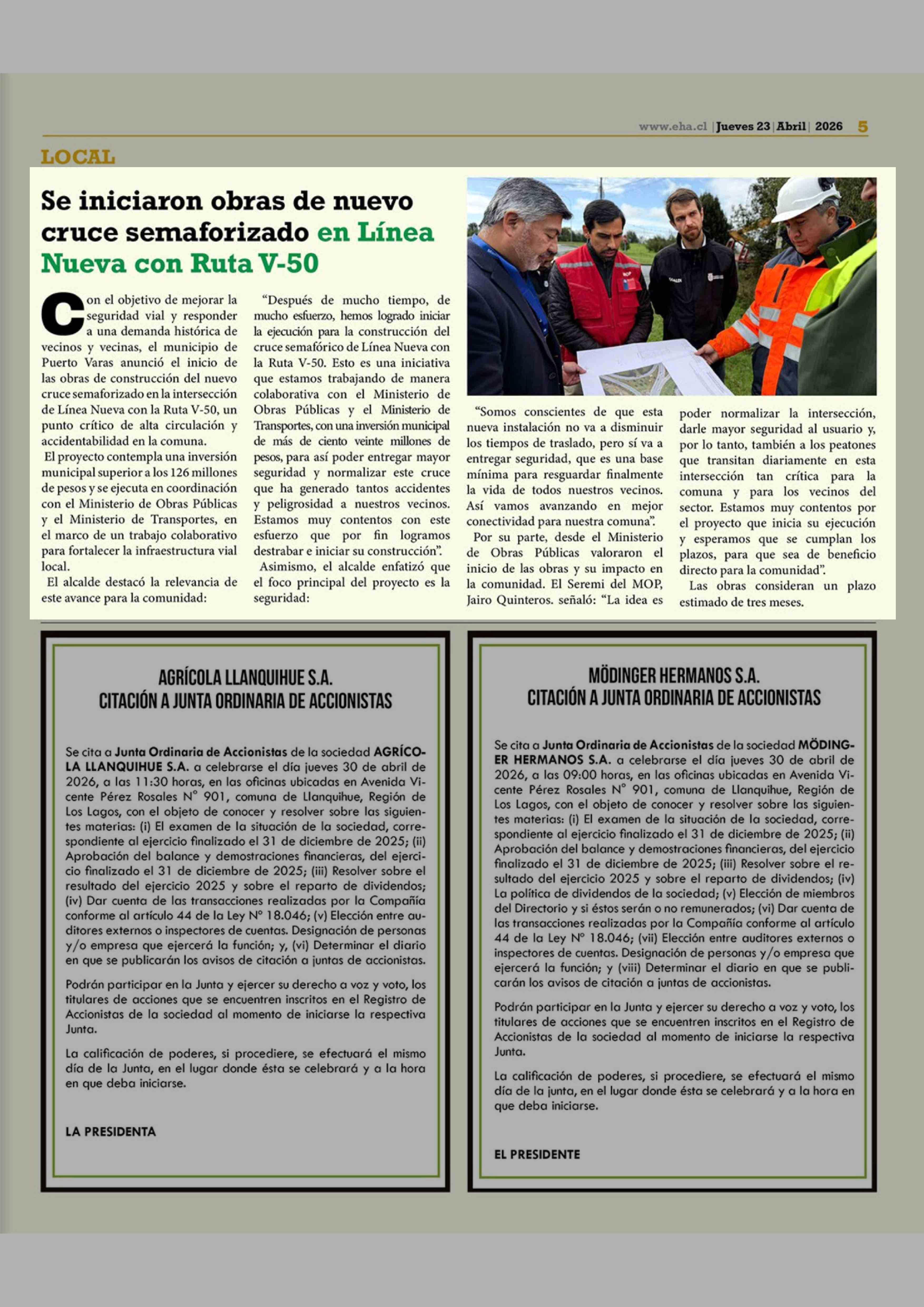 Se iniciaron obras de nuevo cruce semaforizado en Línea Nueva con Ruta V-50 23-04-2026 El Heraldo Austral |