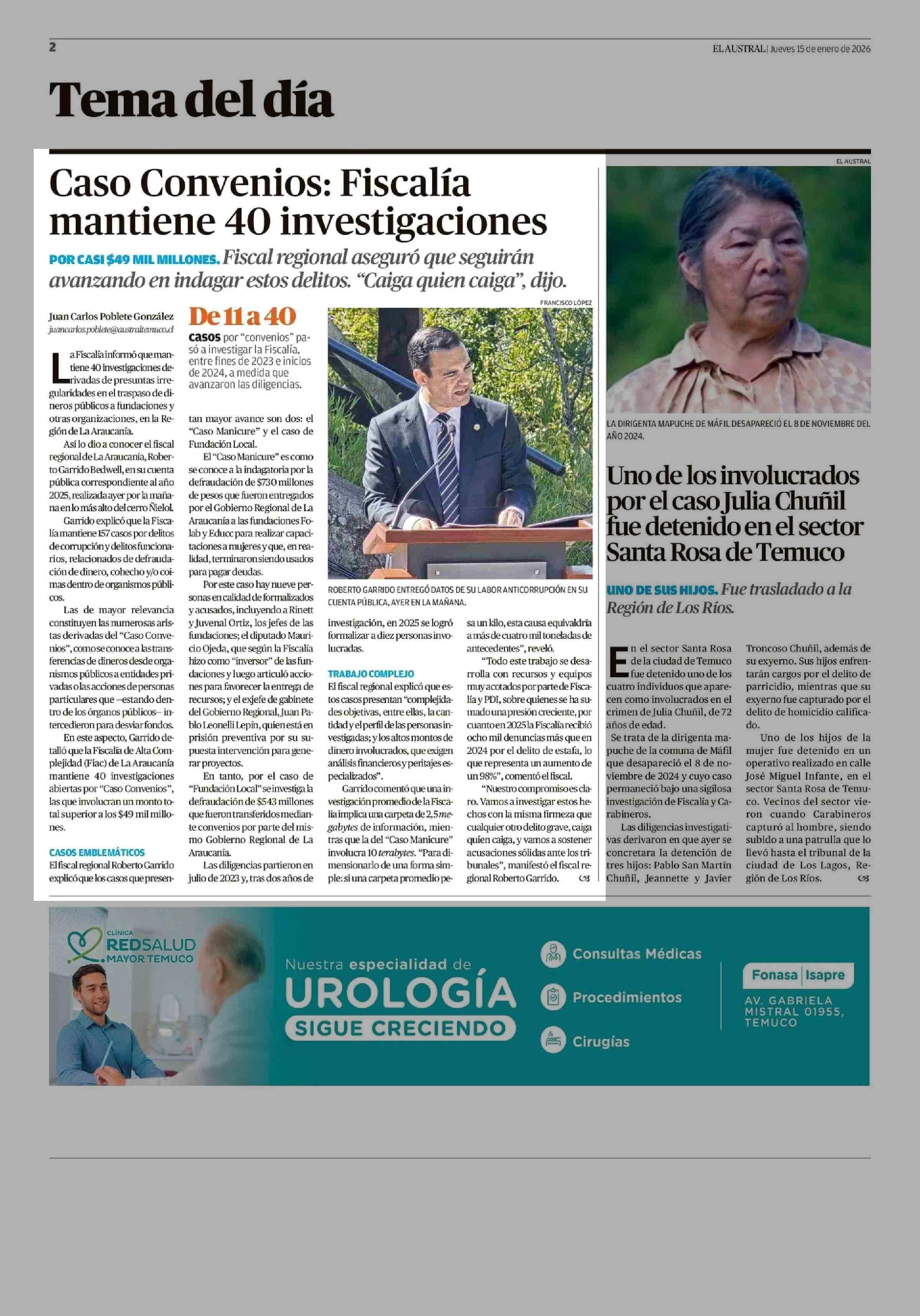 Caso Convenios: Fiscalía mantiene 40 investigaciones 15-01-2026 El Austral de la Araucanía |