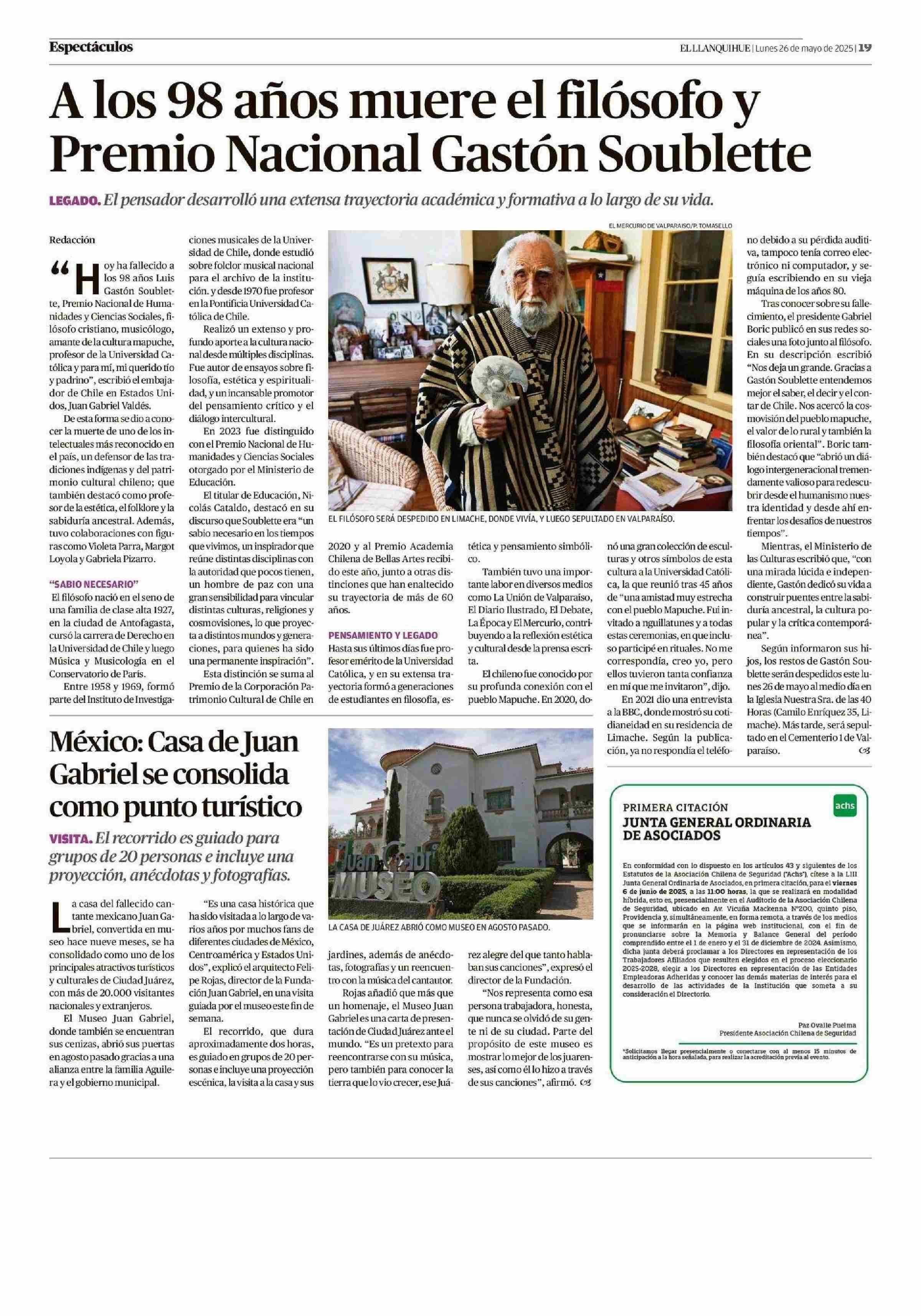 Alos 98 años muere el filósofo y Premio Nacional Gastón Soublette 26-05-2025 El Llanquihue |
