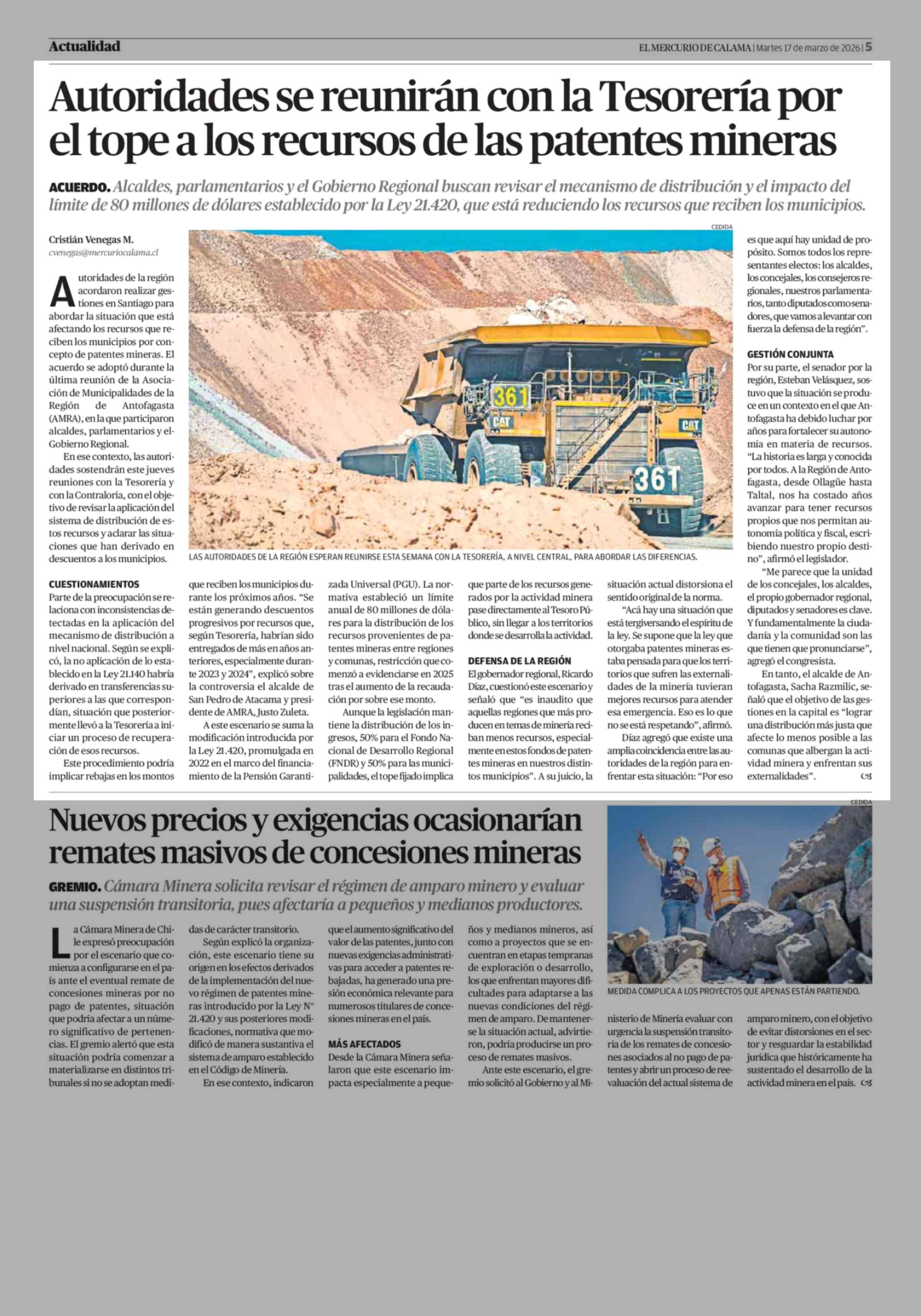 Autoridades se reunirán con la Tesorería por el tope a los recursos de las patentes mineras 17-03-2026 El Mercurio de Calama |