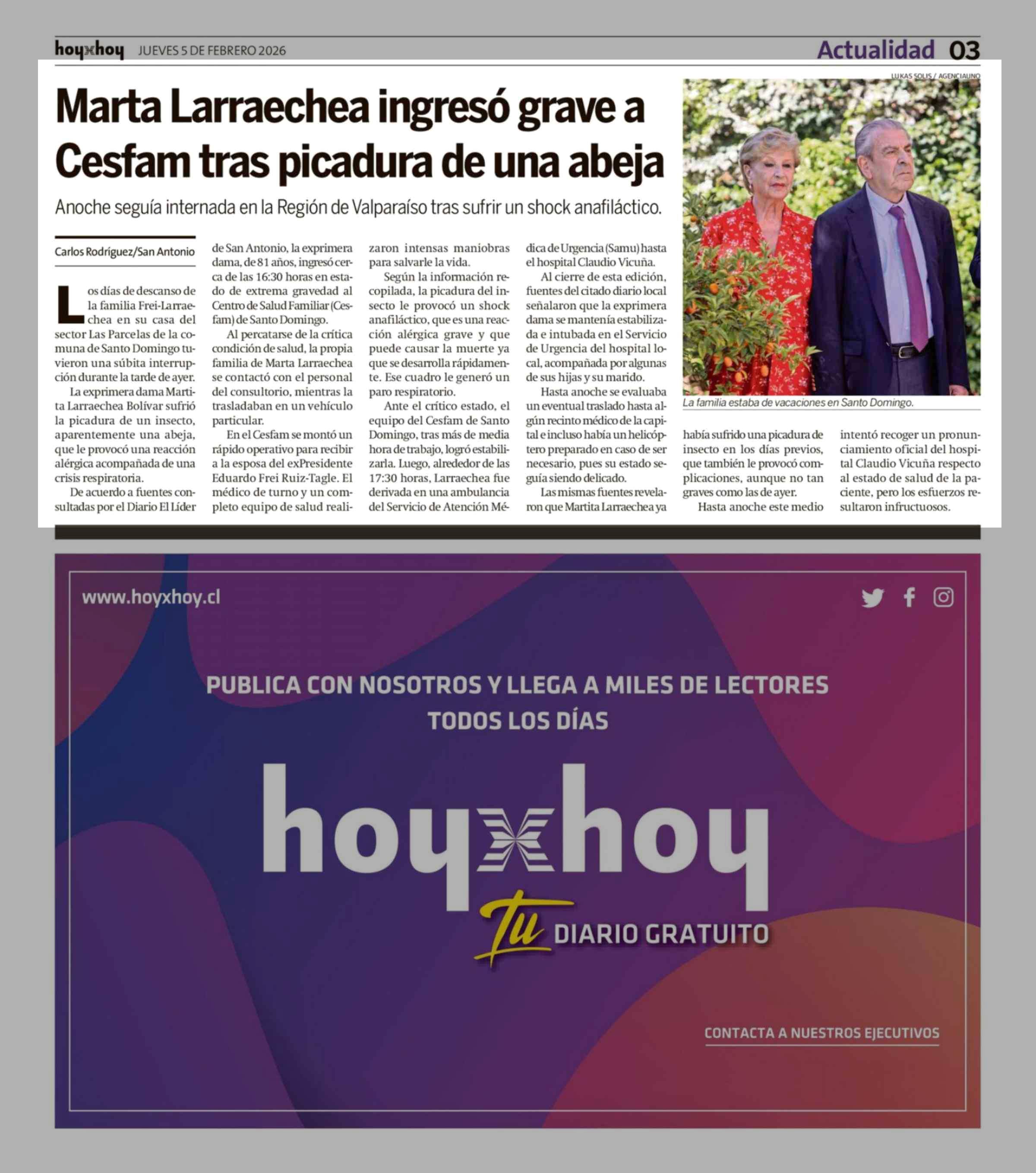 Marta Larraechea ingreso grave a Cesfam tras picadura de una abeja 05-02-2026 Hoy x Hoy |