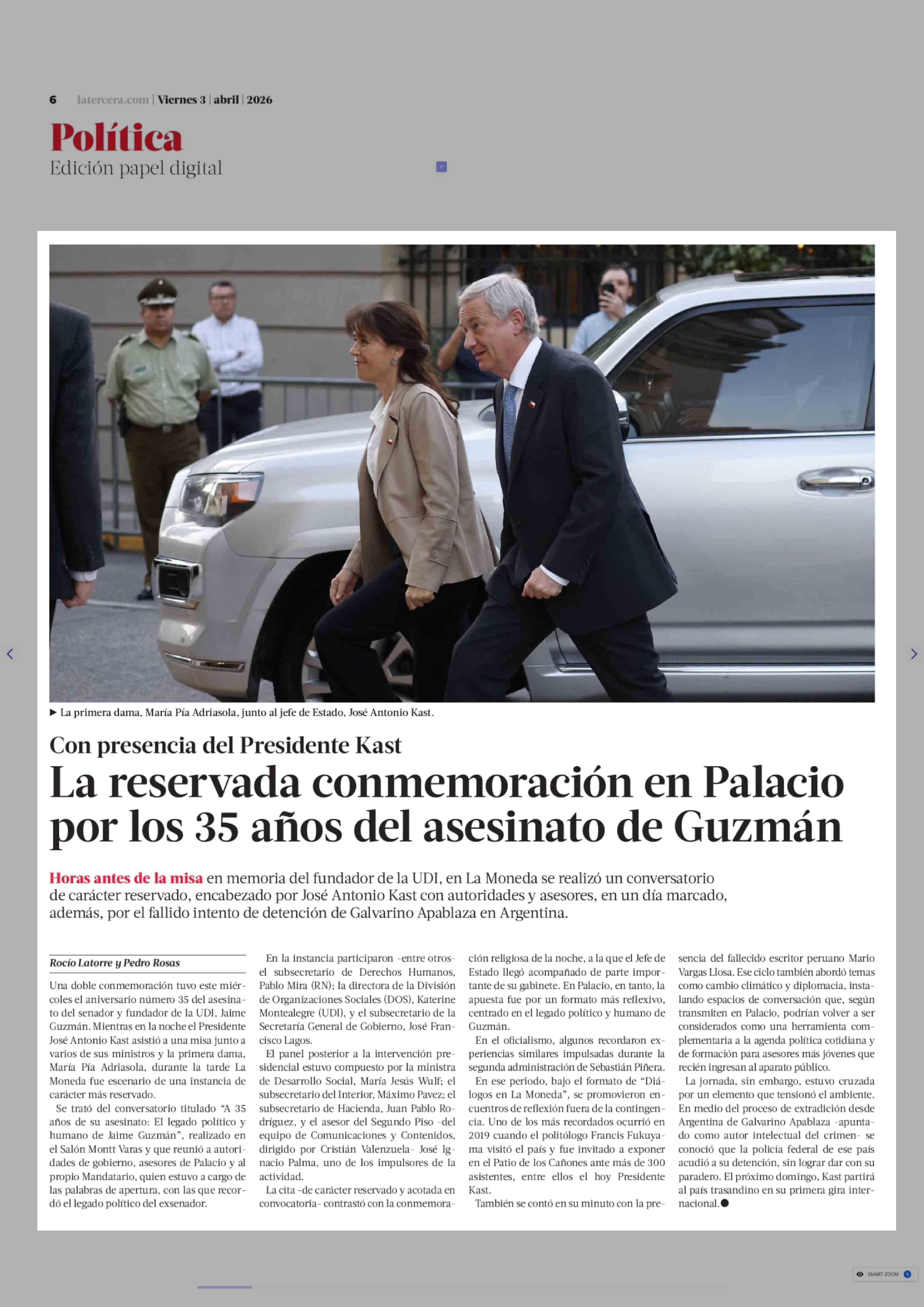 La reservada conmemoración en Palacio por los 35 años del asesinato de Guzmán 03-04-2026 La Tercera |