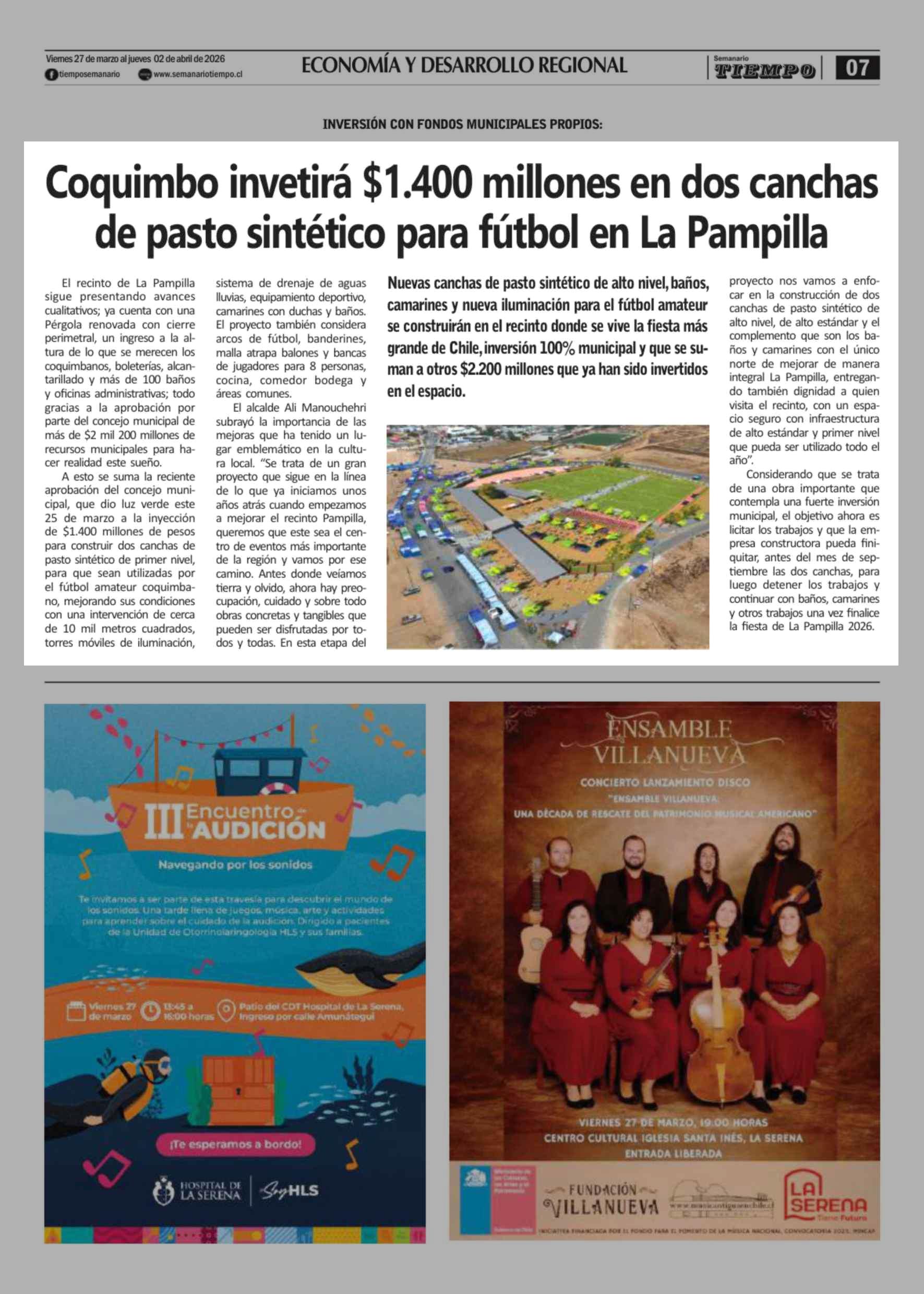 Coquimbo invetirá $1.400 millones en dos canchas de pasto sintético para fútbol en La Pampilla 27-03-2026 Semanario Tiempo |