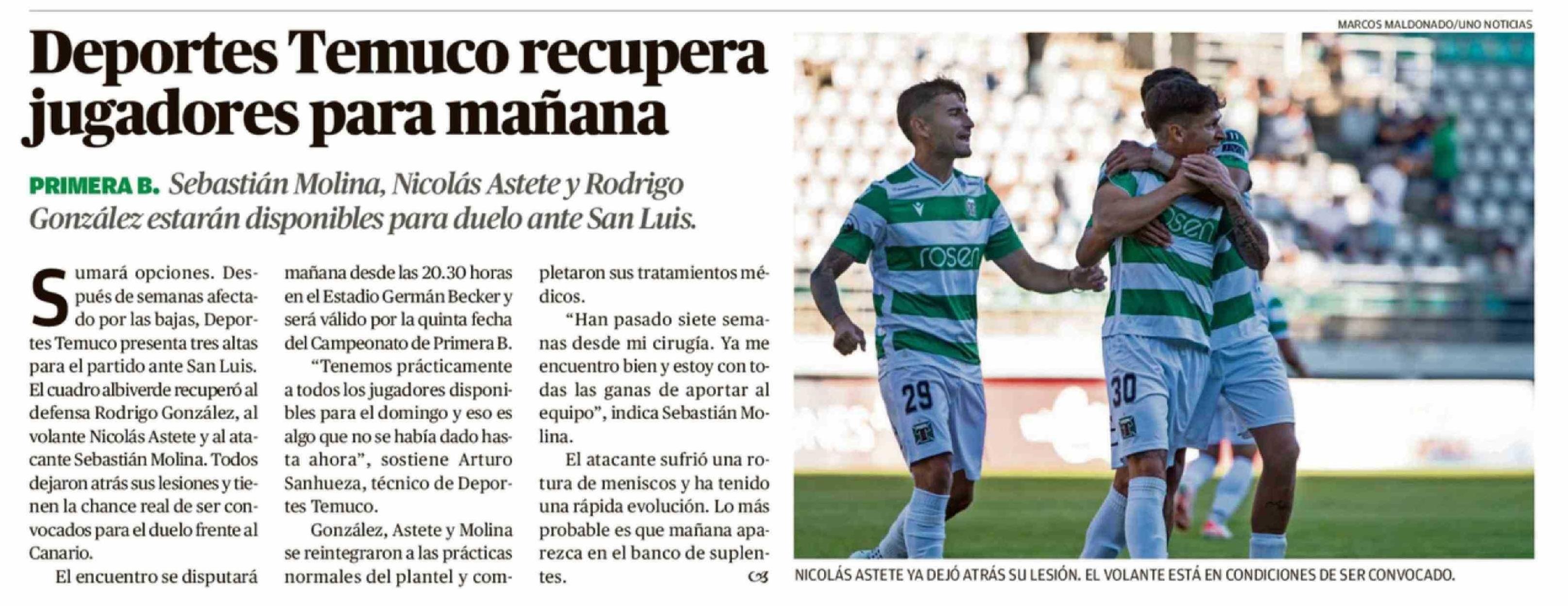 | Título: | Deportes Temuco recupera jugadores para mañana |