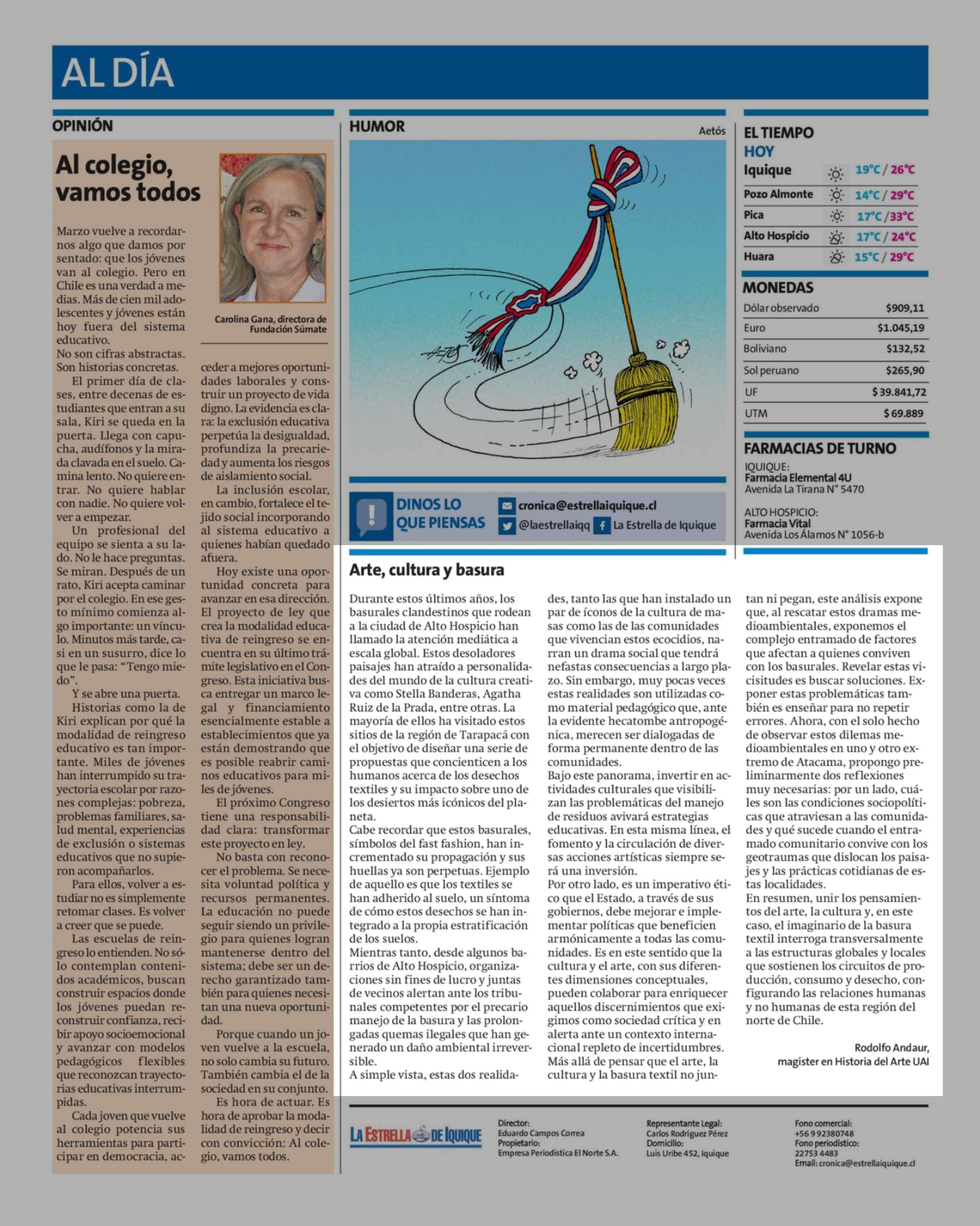 Cartas: Arte, cultura y basura 17-03-2026 La Estrella de Iquique |