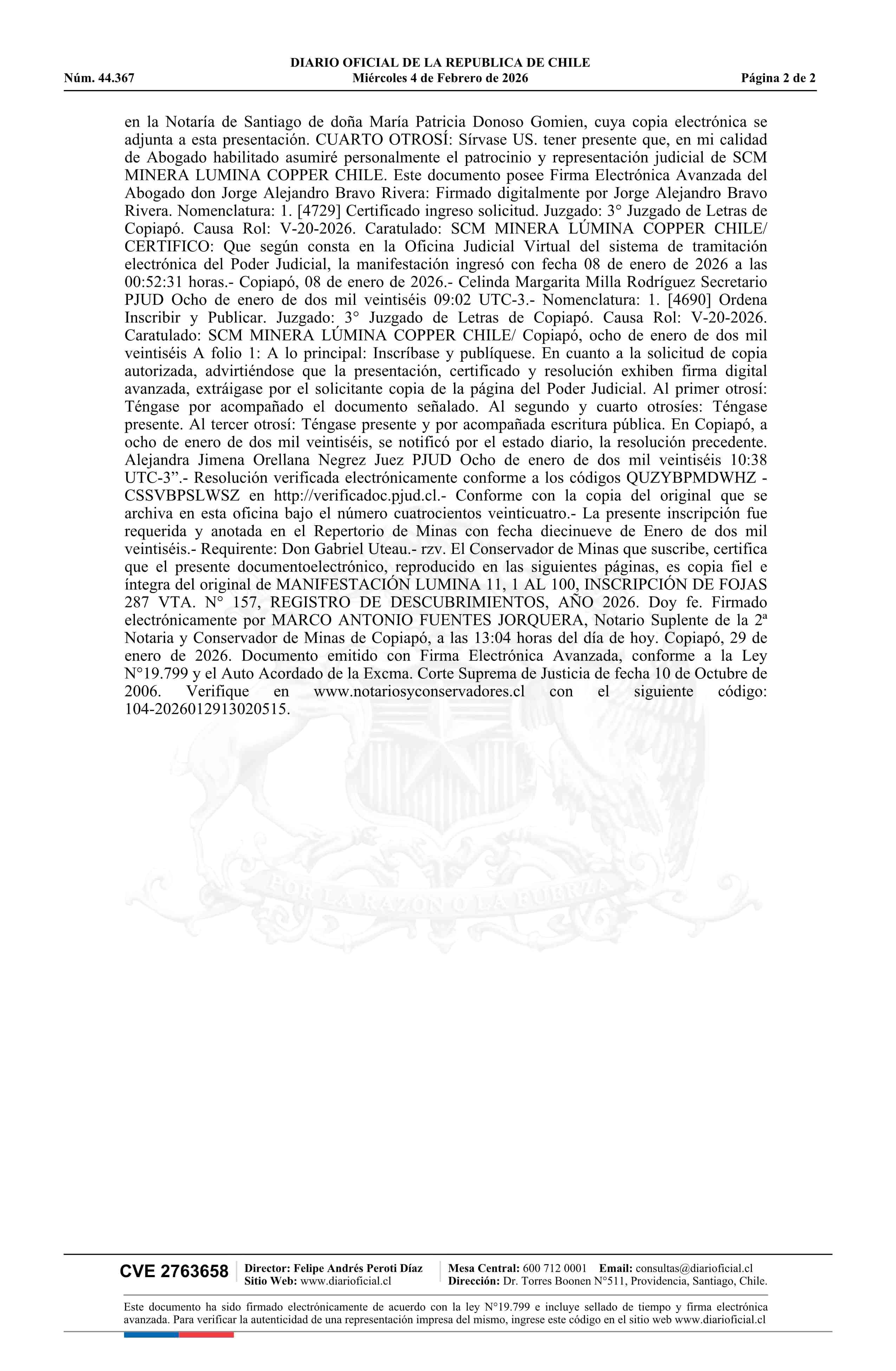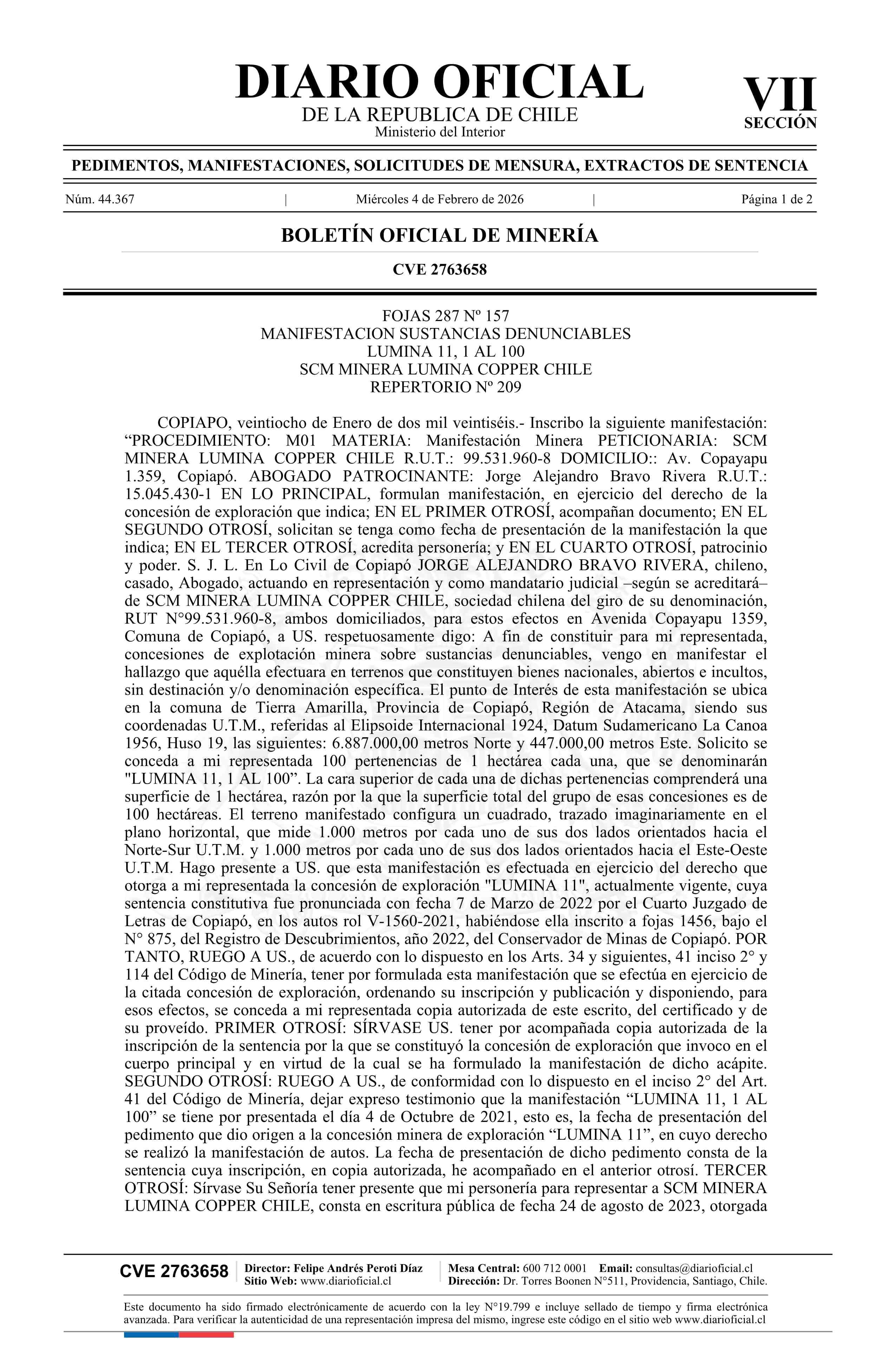 LUMINA 11, 1 AL 100 / SCM Minera Lumina Copper Chile 04-02-2026 DIARIO OFICIAL CHILE - BOLETÍN OFICIAL DE MINERÍA |