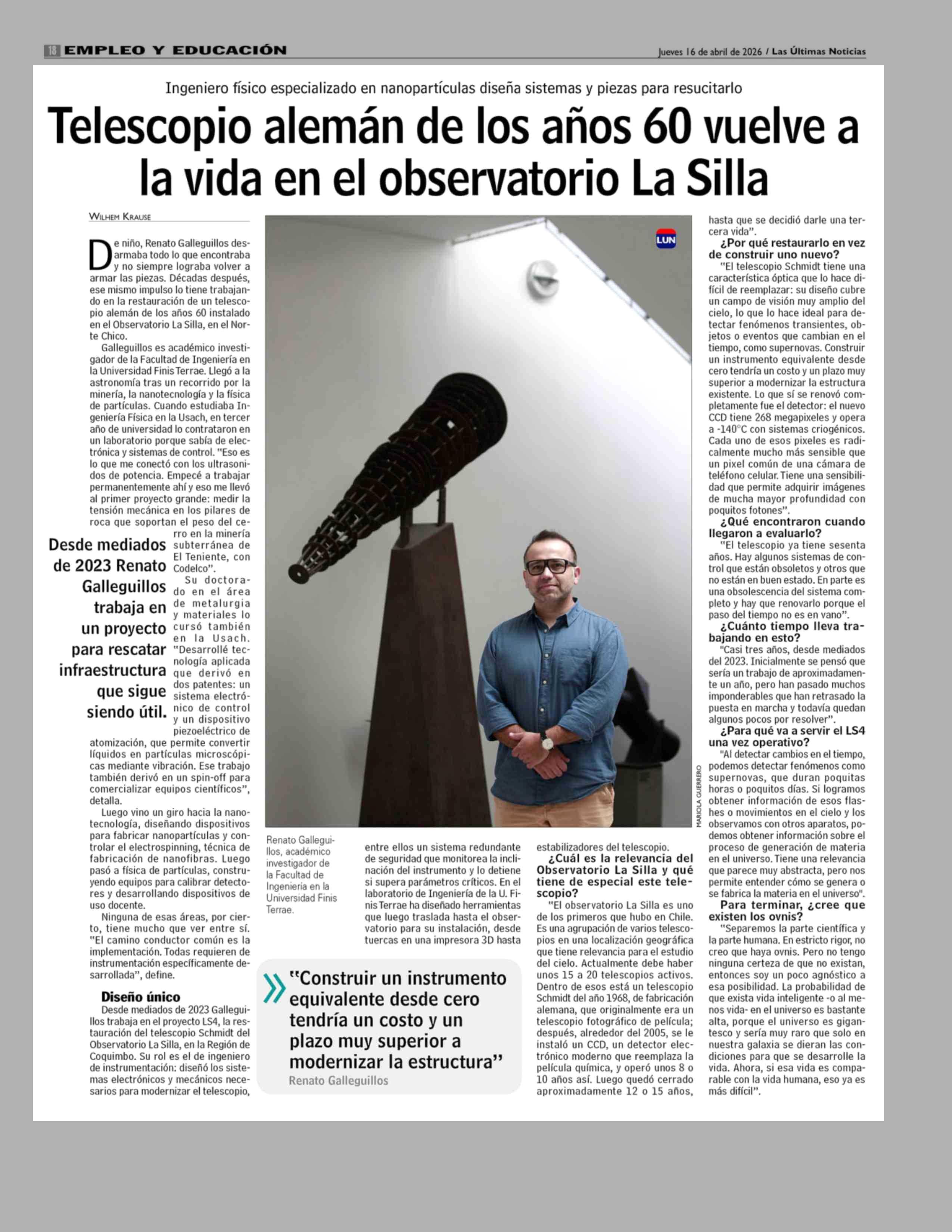 Telescopio alemán de los años 60 vuelve a la vida en el observatorio La Silla 16-04-2026 Las Últimas Noticias |