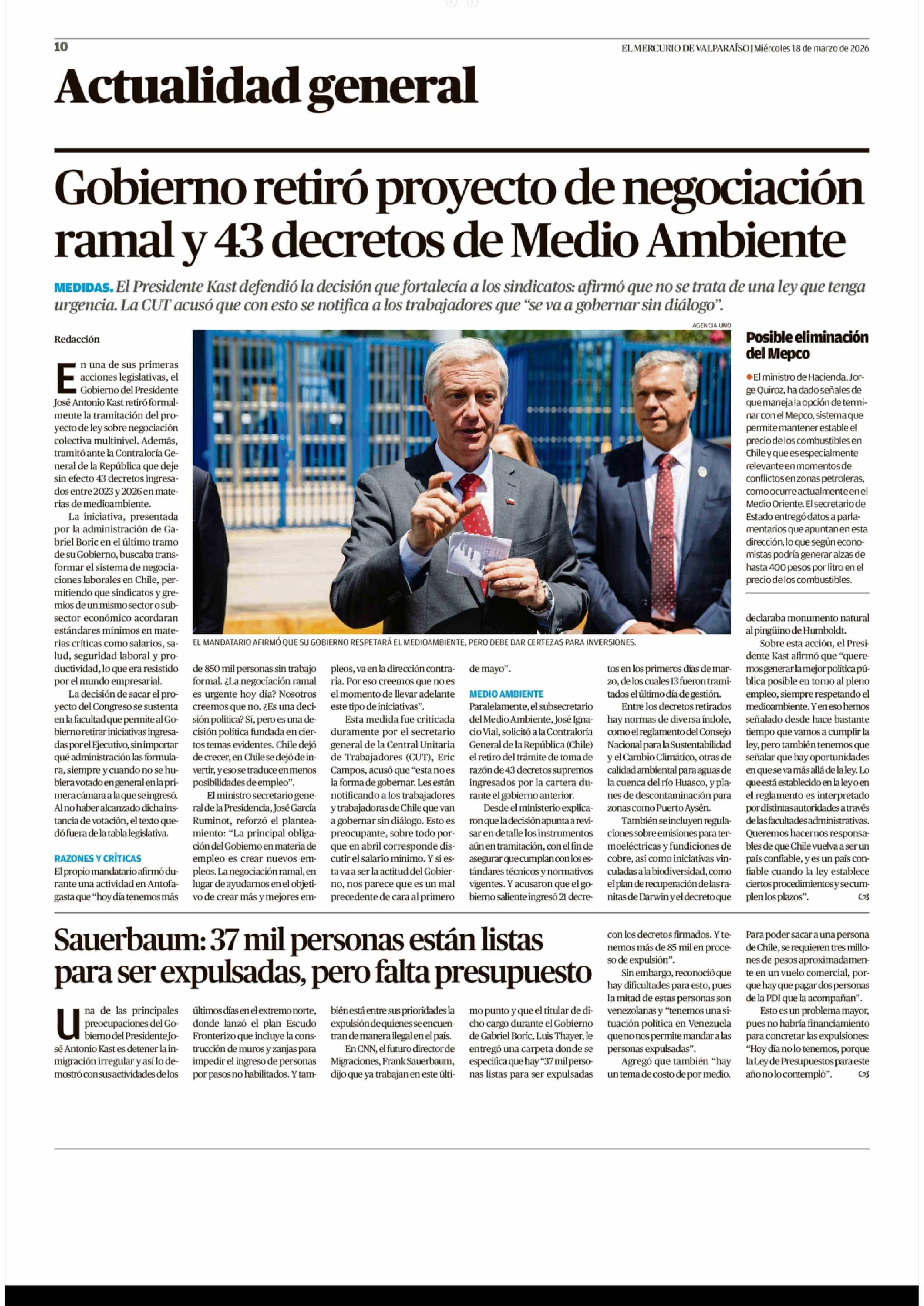 Gobierno retiró proyecto de negociación ramal y 43 decretos de Medio Ambiente 18-03-2026 El Mercurio de Valparaíso |