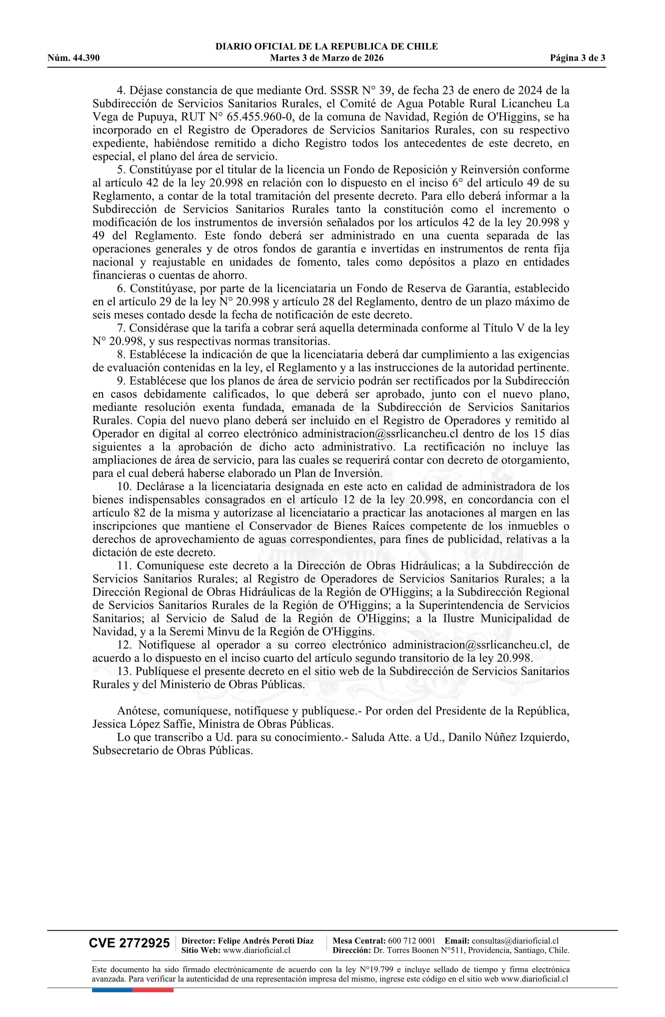 Decreto exento número 34, de 2026.- Reconoce licencia de servicio sanitario rural al Comité de Agua Potable Rural Licancheu La Vega de Pupuya, comuna de Navidad, provincia de Cardenal Caro, Región del Libertador Bernardo O'Higgins, y da cuenta de su registro como operador