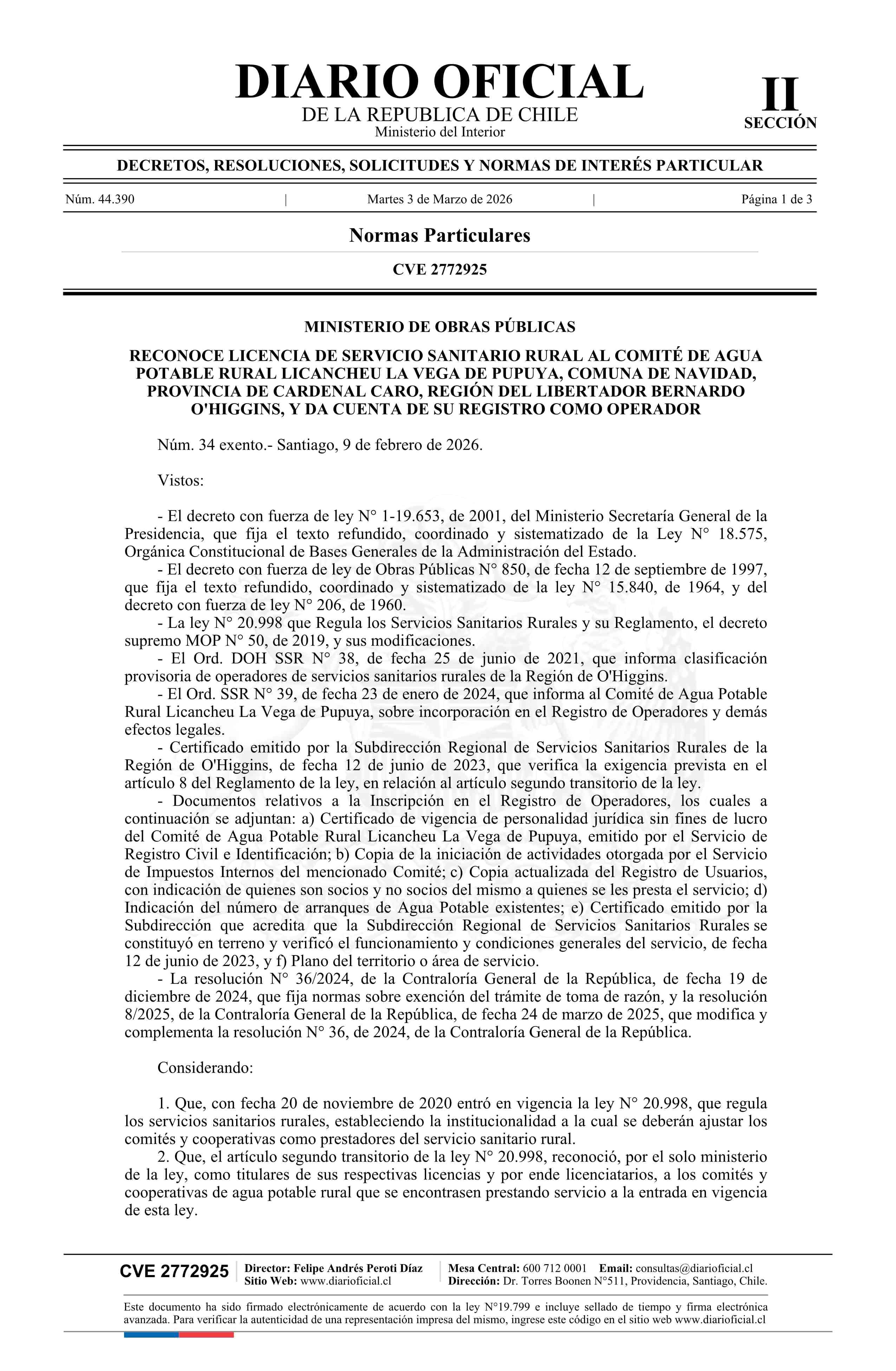 Título: Decreto exento número 34, de 2026.- Reconoce licencia de servicio sanitario rural al Comité de Agua Potable Rural Licancheu La Vega de Pupuya, comuna de Navidad, provincia de Cardenal Caro, Región del Libertador Bernardo O'Higgins, y da cuenta de su registro como operador