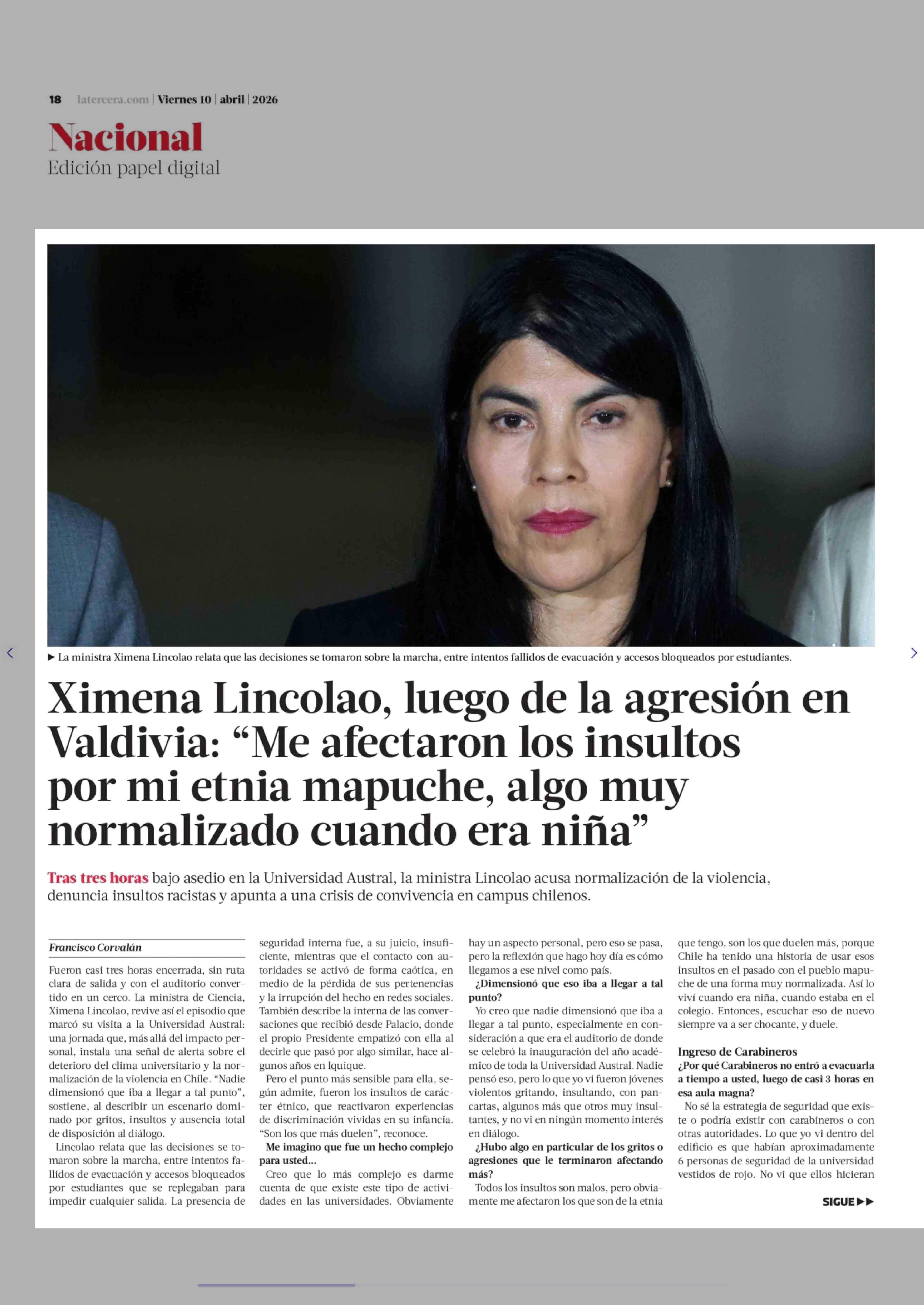 Título: Ximena Lincolao, luego de la agresión en Valdivia: "Me afectaron los insultos por mi etnia mapuche, algo muy normalizado cuando era niña"