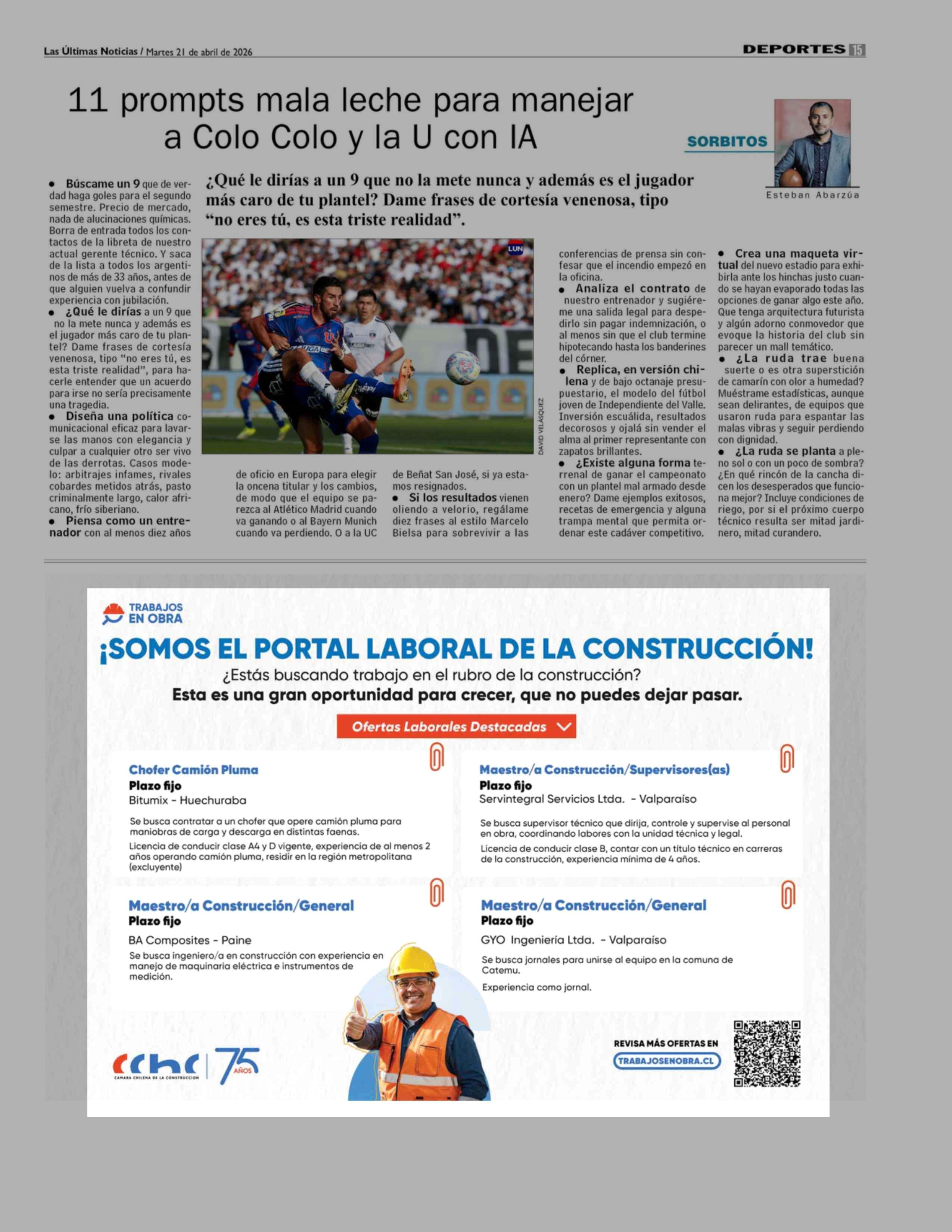 Aviso Publicitario: TRABAJOS EN OBRA 21-04-2026 Las Últimas Noticias |