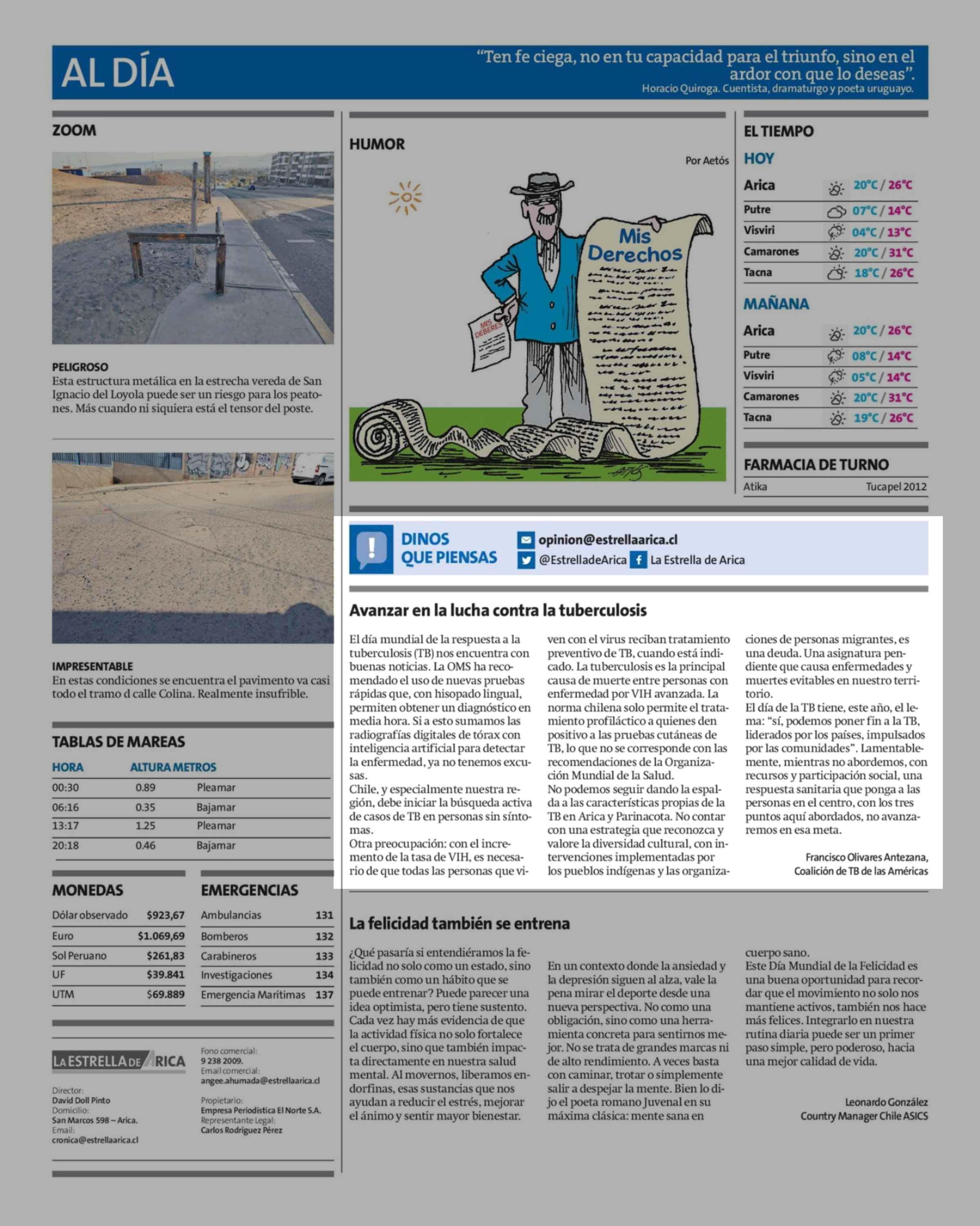 Cartas: Avanzar en la lucha contra la tuberculosis 24-03-2026 La Estrella de Arica |