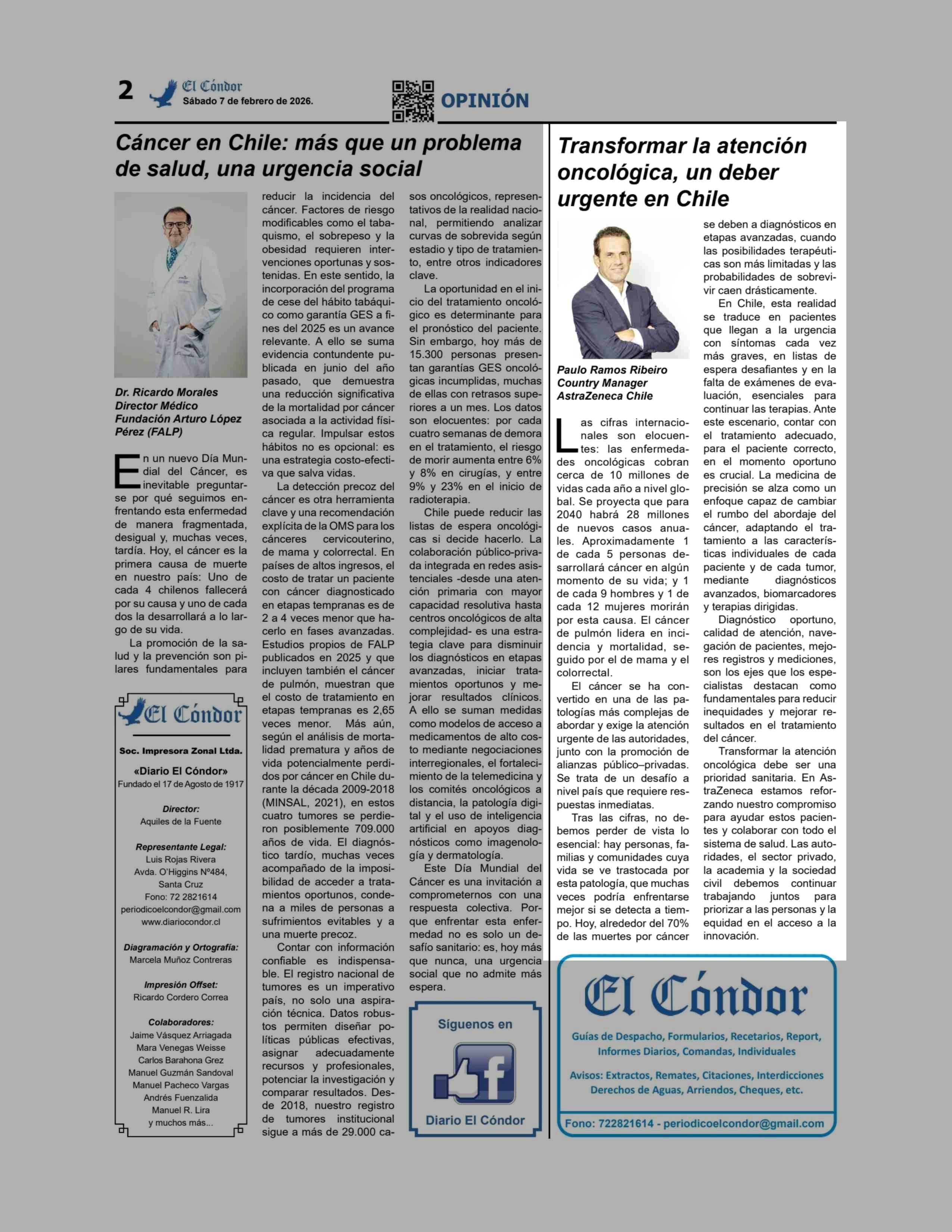 Columnas de Opinión: Transformar la atención oncológica, un deber urgente en Chile 07-02-2026 Diario El Cóndor |