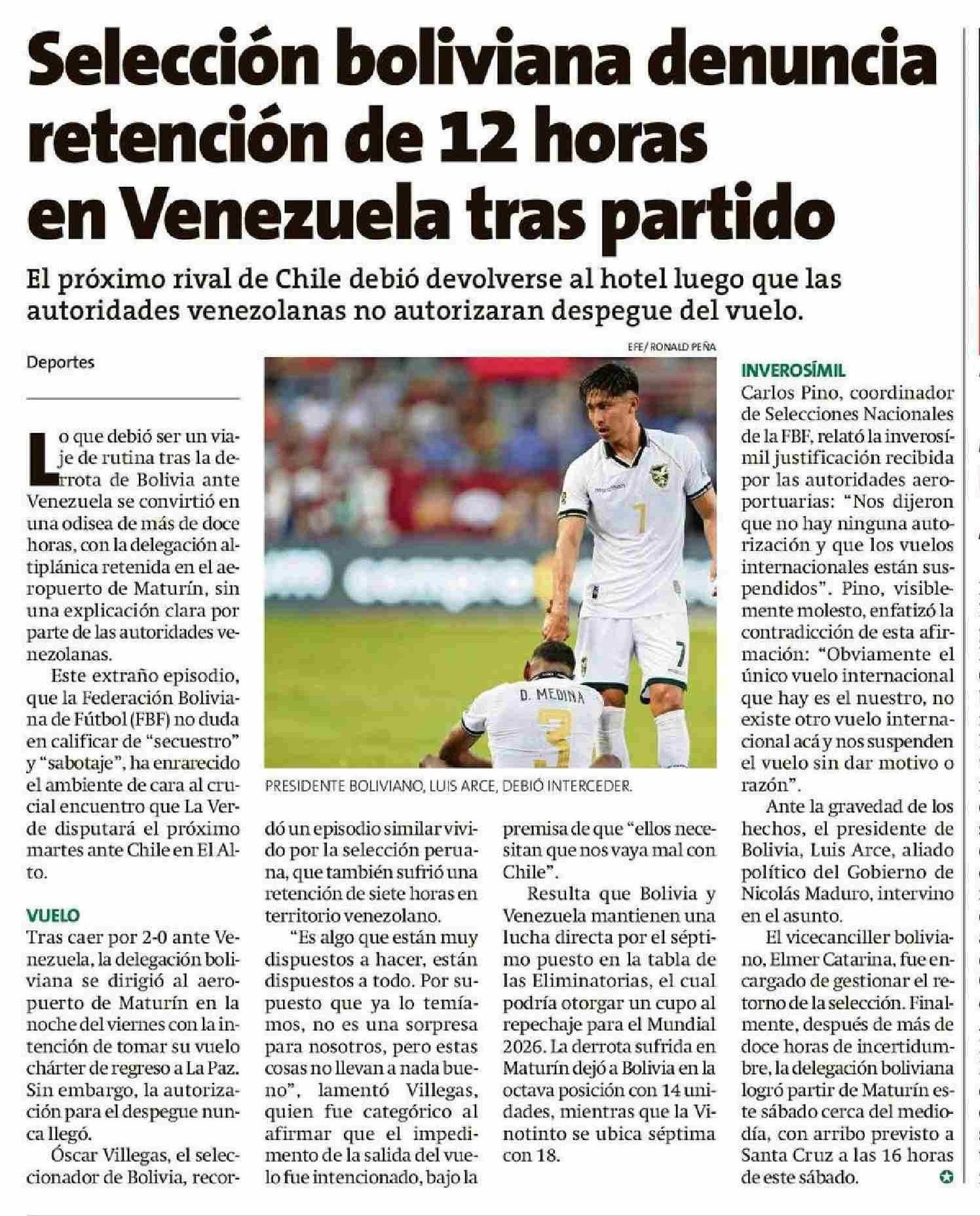 | Título: | Selección boliviana denuncia retención de 12 horas en Venezuela tras partido |