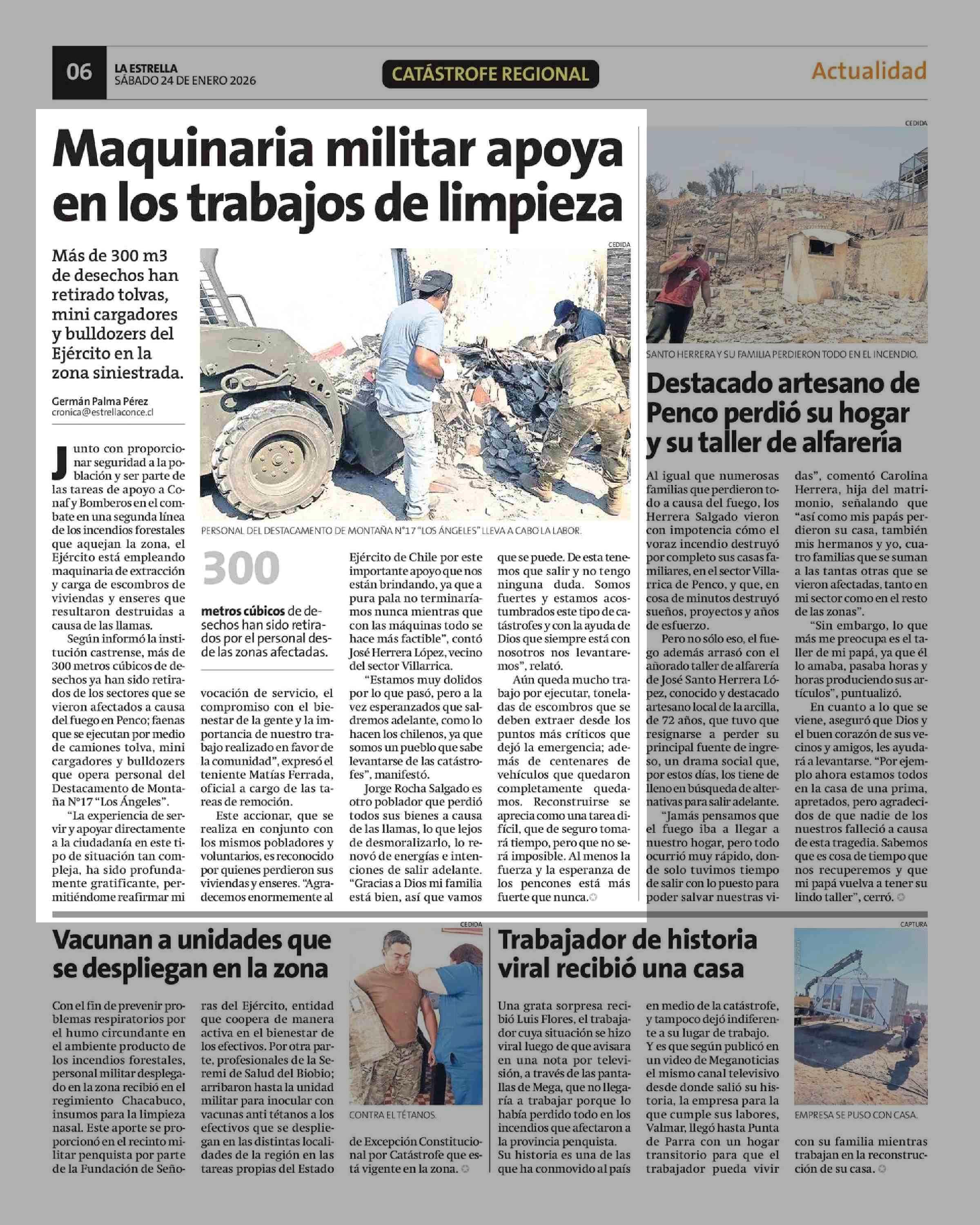 Maquinaria militar apoya en los trabajos de limpieza 24-01-2026 La Estrella de Concepción |