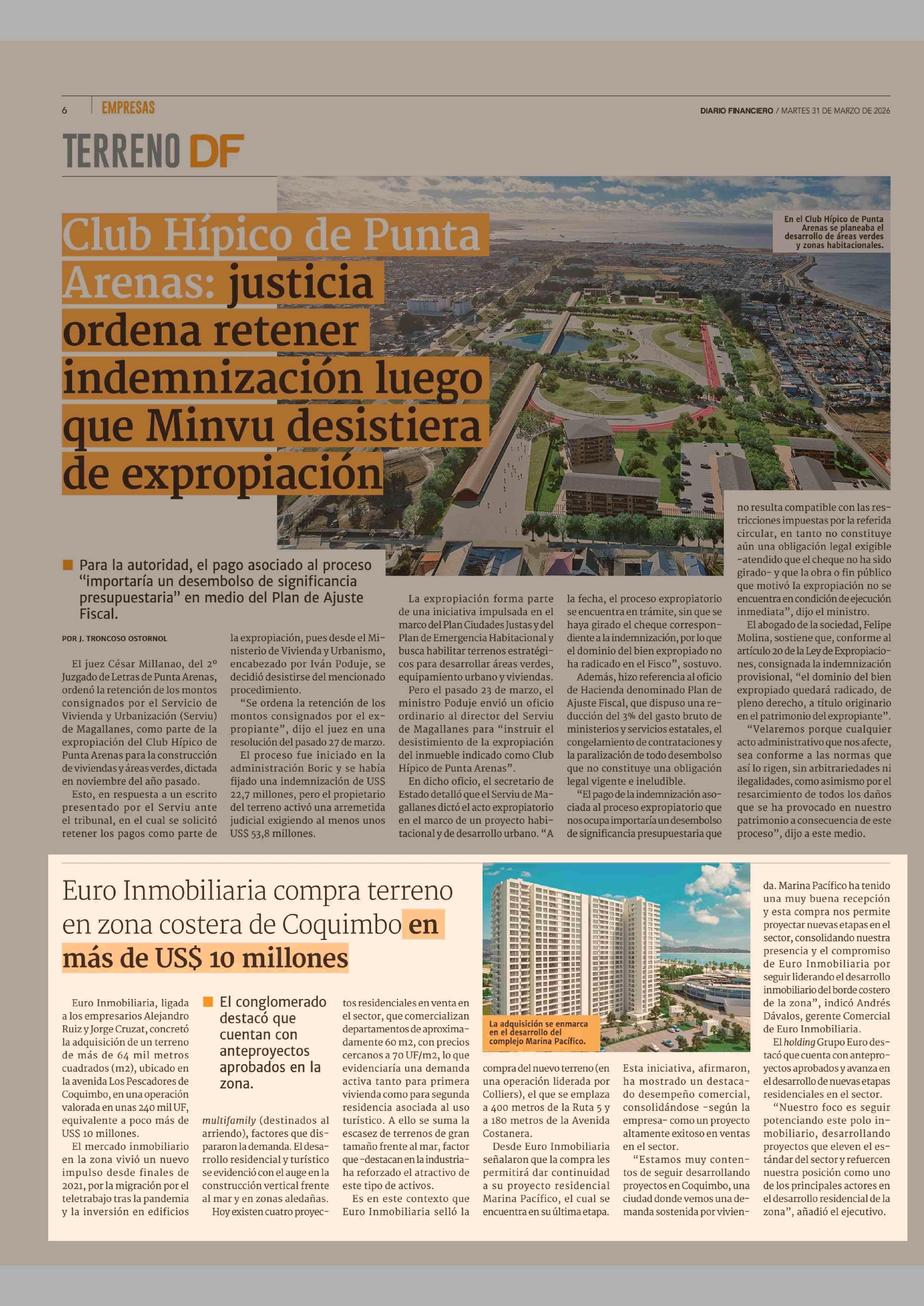 Euro Inmobiliaria compra terreno en zona costera de Coquimbo en más de US$ 10 millones 31-03-2026 Diario Financiero |