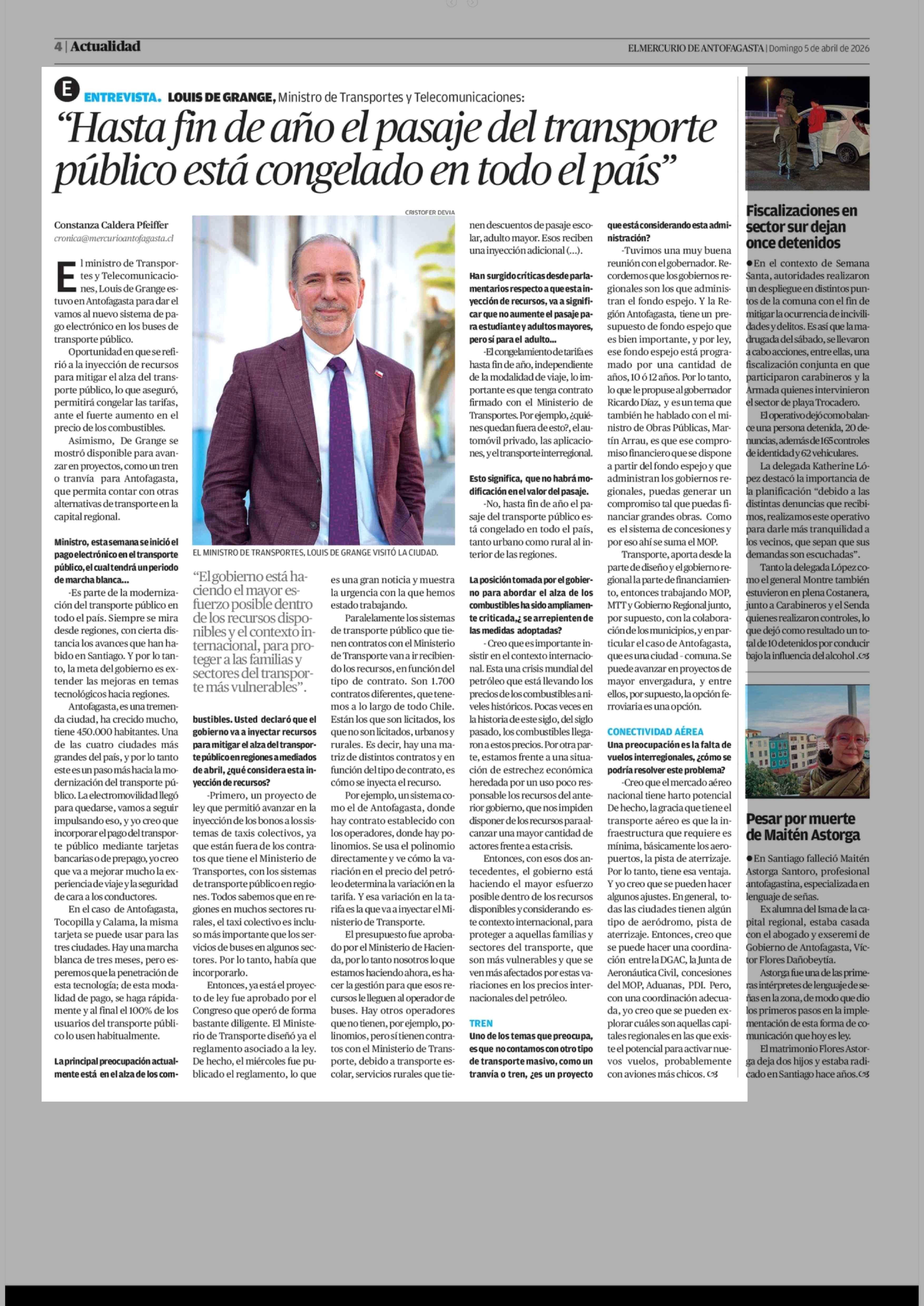 "Hasta fin de año el pasaje del transporte público está congelado en todo el país" 05-04-2026 El Mercurio de Antofagasta |