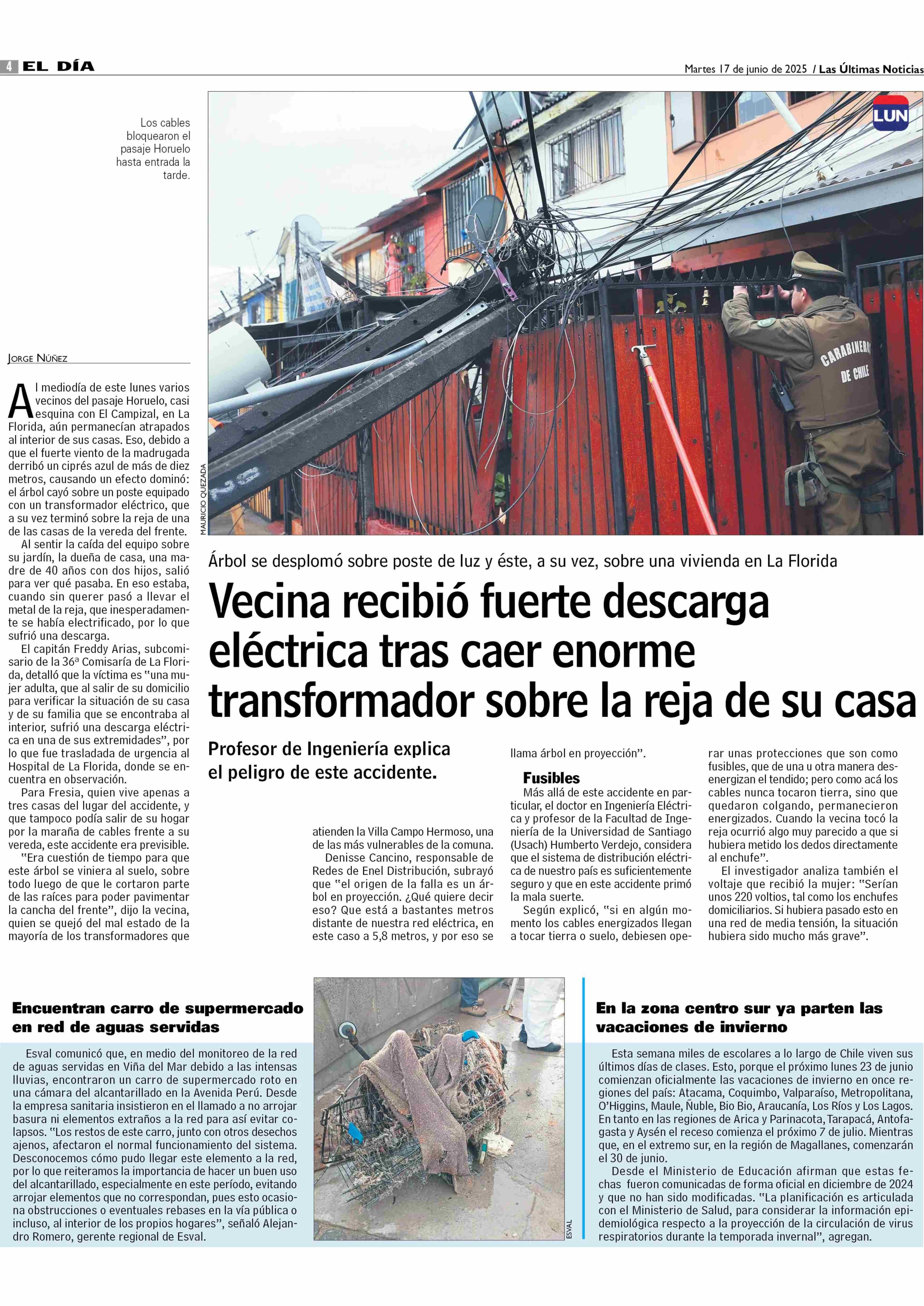 Vecina recibió fuerte descarga eléctrica tras caer enorme transformador sobre la reja de su casa 17-06-2025 Las Últimas Noticias |