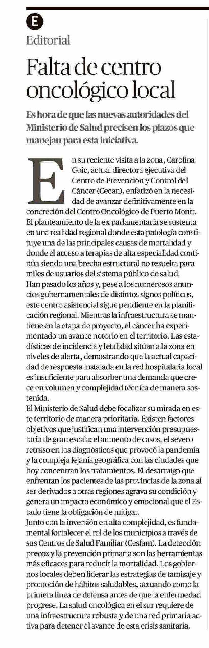 EDITORIAL: Falta de centro oncológico local 14-04-2026 El Llanquihue |