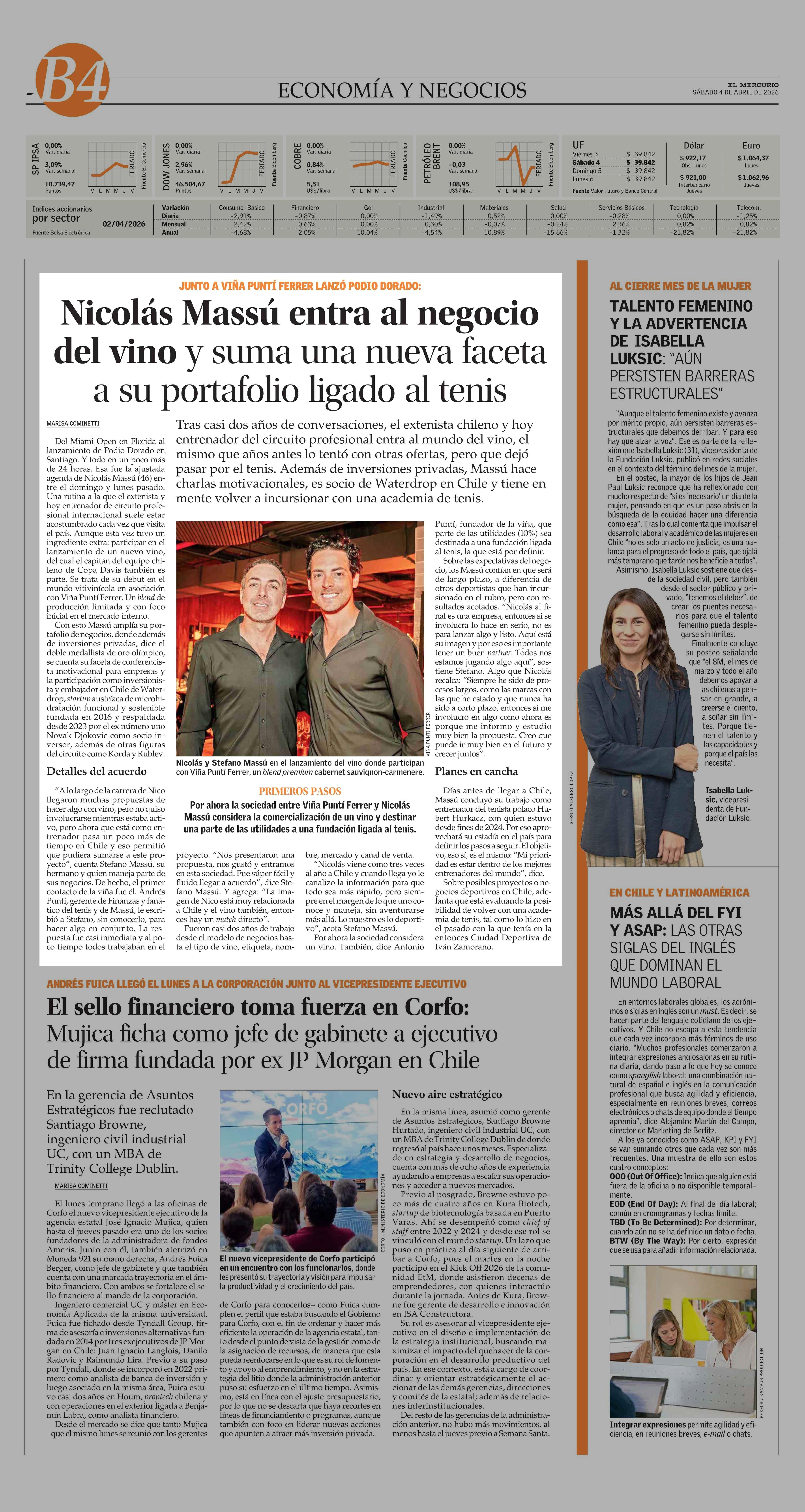 Nicolás Massú entra al negocio del vino y suma una nueva faceta a su portafolio ligado al tenis 04-04-2026 El Mercurio |