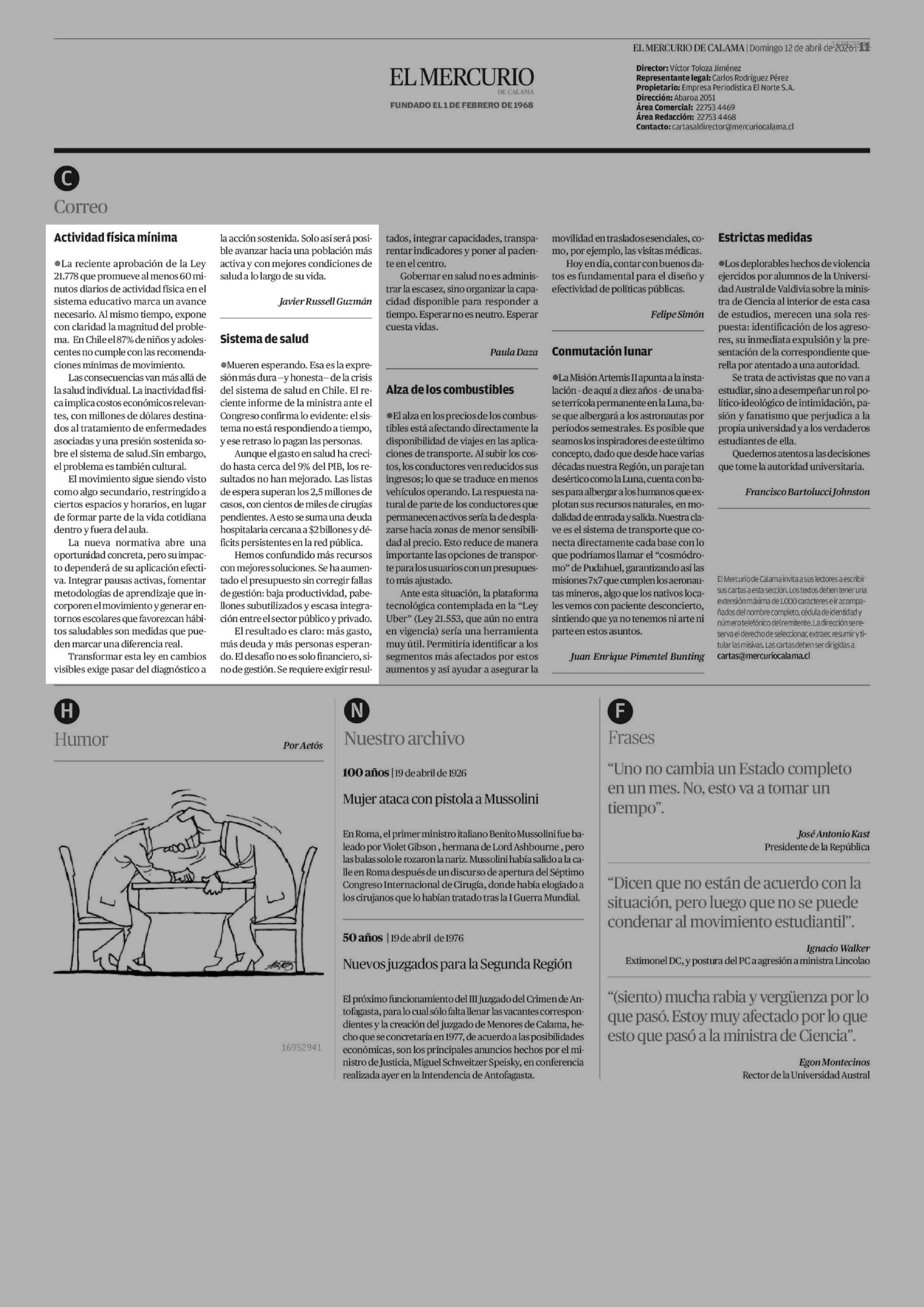 CARTAS: Actividad física mínima 12-04-2026 El Mercurio de Calama |