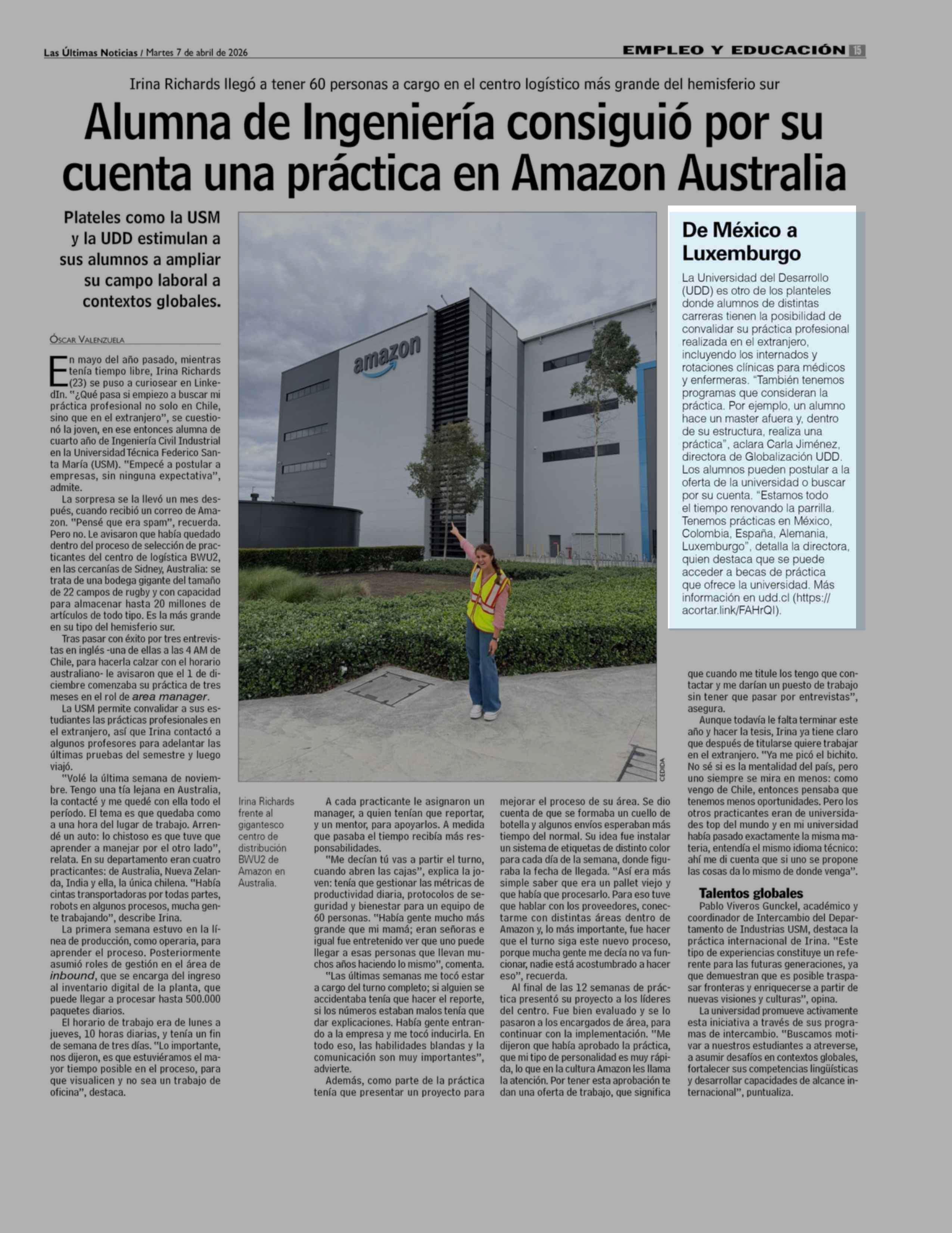 | Título: | De México a Luxemburgo La Universidad del Desarrollo (UDD) es otro de los planteles donde alumnos de distintas carreras tienen la posibilidad de convalidar su práctica profesional realizada en el extranjero, incluyendo los internados y rotaciones clínicas para médicos y enfermeras. "También tenemos |
