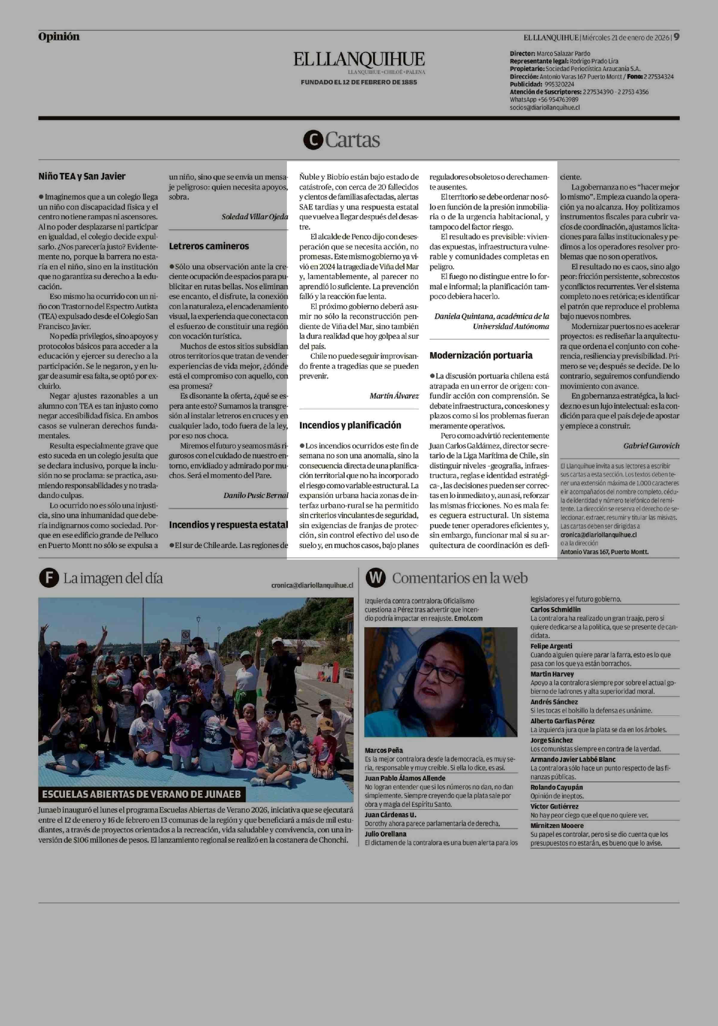 Cartas: Incendios y planificación 21-01-2026 El Llanquihue |