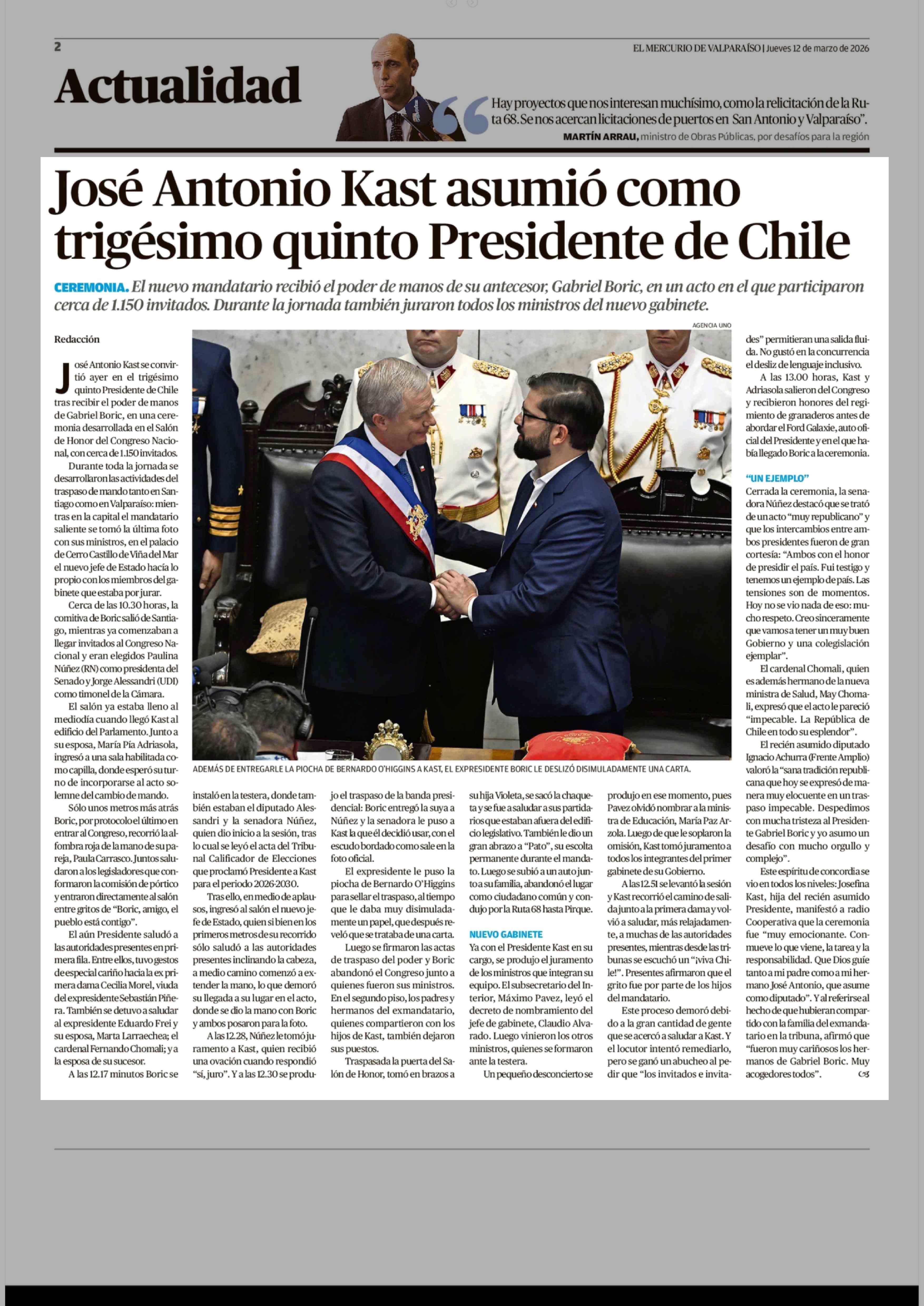 José Antonio Kast asumió como trigésimo quinto Presidente de Chile 12-03-2026 El Mercurio de Valparaíso |