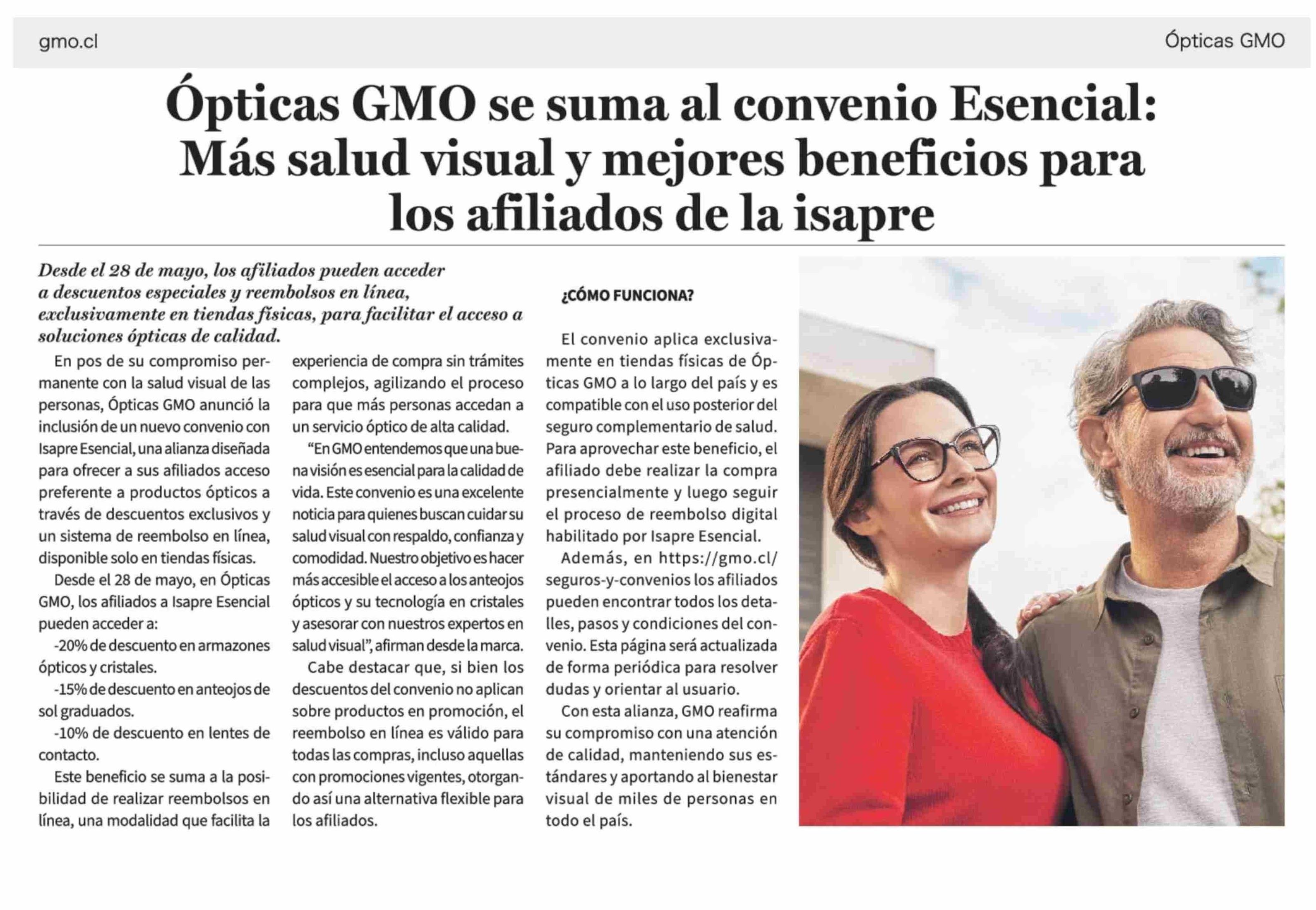 Ópticas GMO se suma al convenio Esencial: Más salud visual y mejores beneficios para los afiliados de la isapre 08-06-2025 La Tercera |