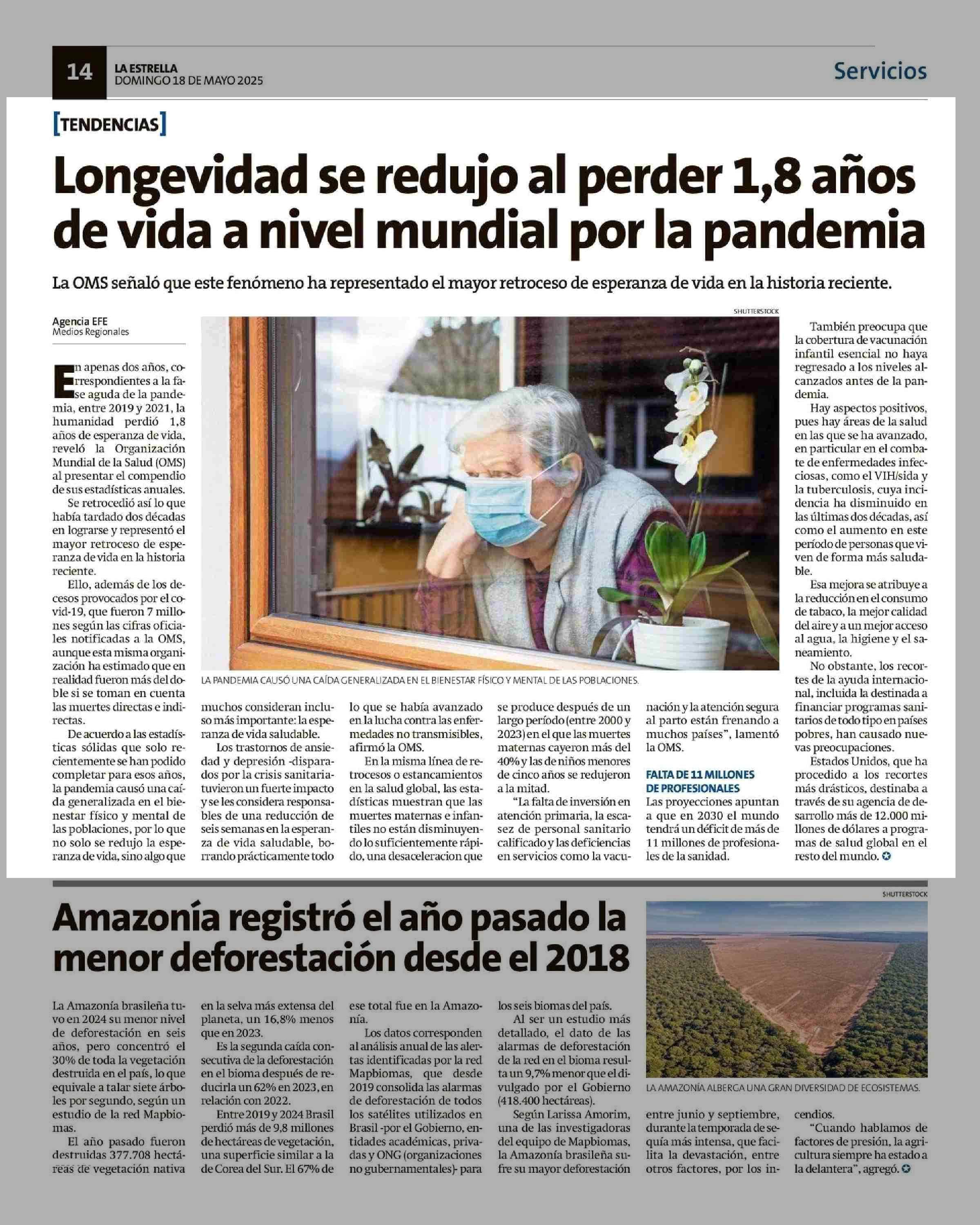 Longevidad se redujo al perder 1,8 años de vida a nivel mundial por la pandemia 18-05-2025 La Estrella de Chiloé |