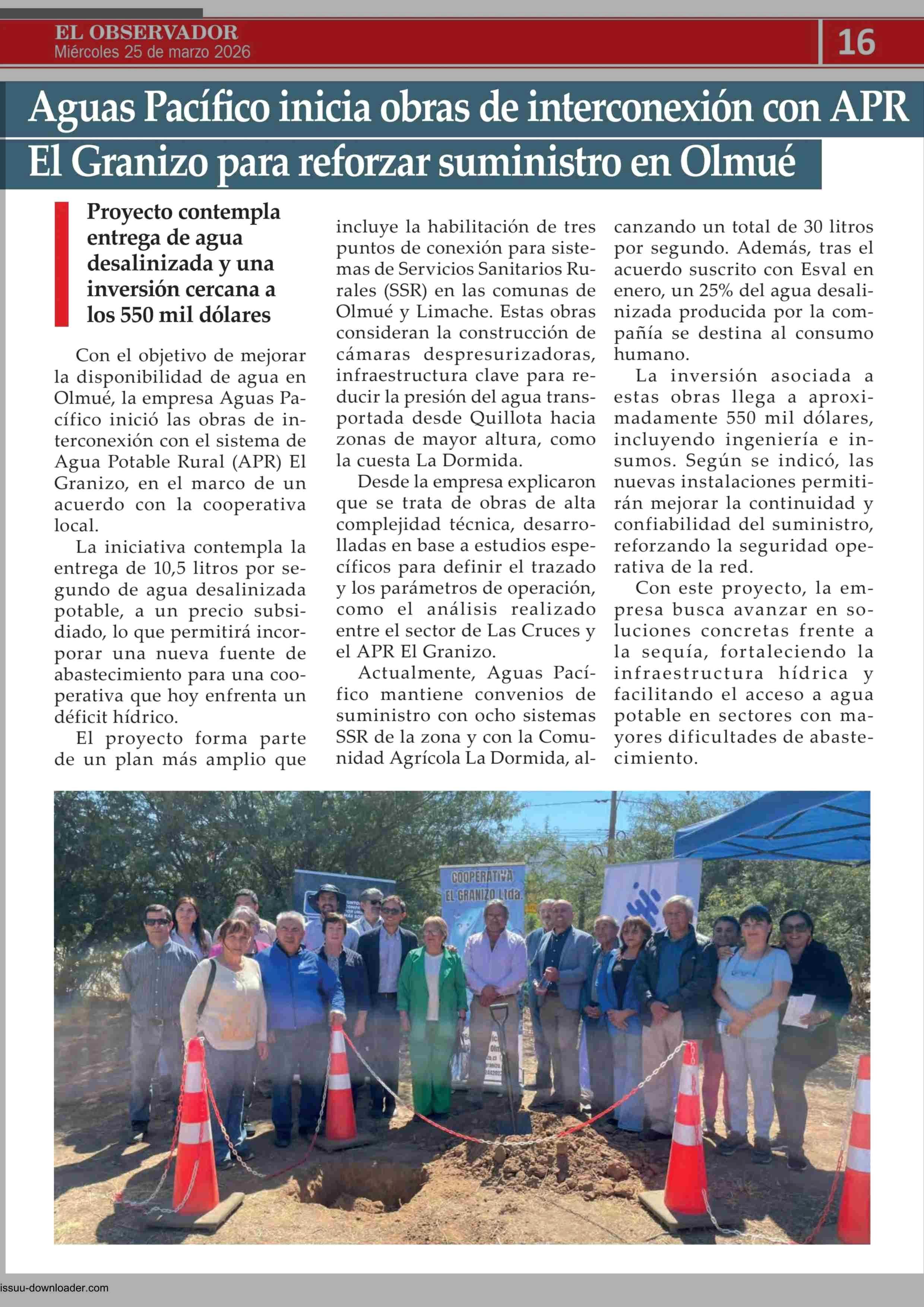 | Título: | Aguas Pacífico inicia obras de interconexión con APR El Granizo para reforzar suministro en Olmué |